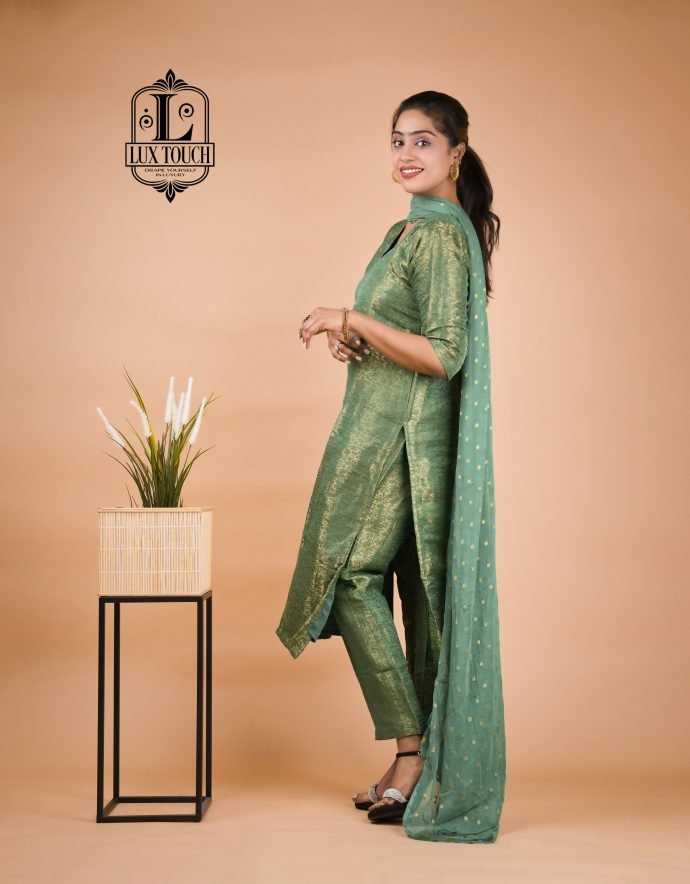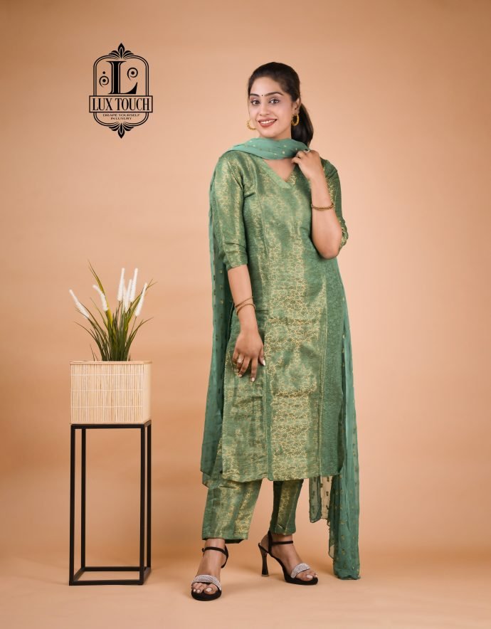 A Banarasi suit set is a beautiful representation of traditional Indian craftsmanship, known for its luxurious fabric and intricate designs. Originating from Varanasi, these sets are woven from fine silk, often interwoven with gold or silver threads, which give them a regal and opulent appearance. The kameez (top) is typically rich in traditional motifs like paisleys, floral patterns, and brocade work, with a soft sheen that enhances its elegance. The design often includes embroidery, sequins, or intricate weaving, showcasing the skill of artisans. Tailored to a flattering silhouette, the kameez may feature different necklines, such as round or V-shaped, adding to its versatility.