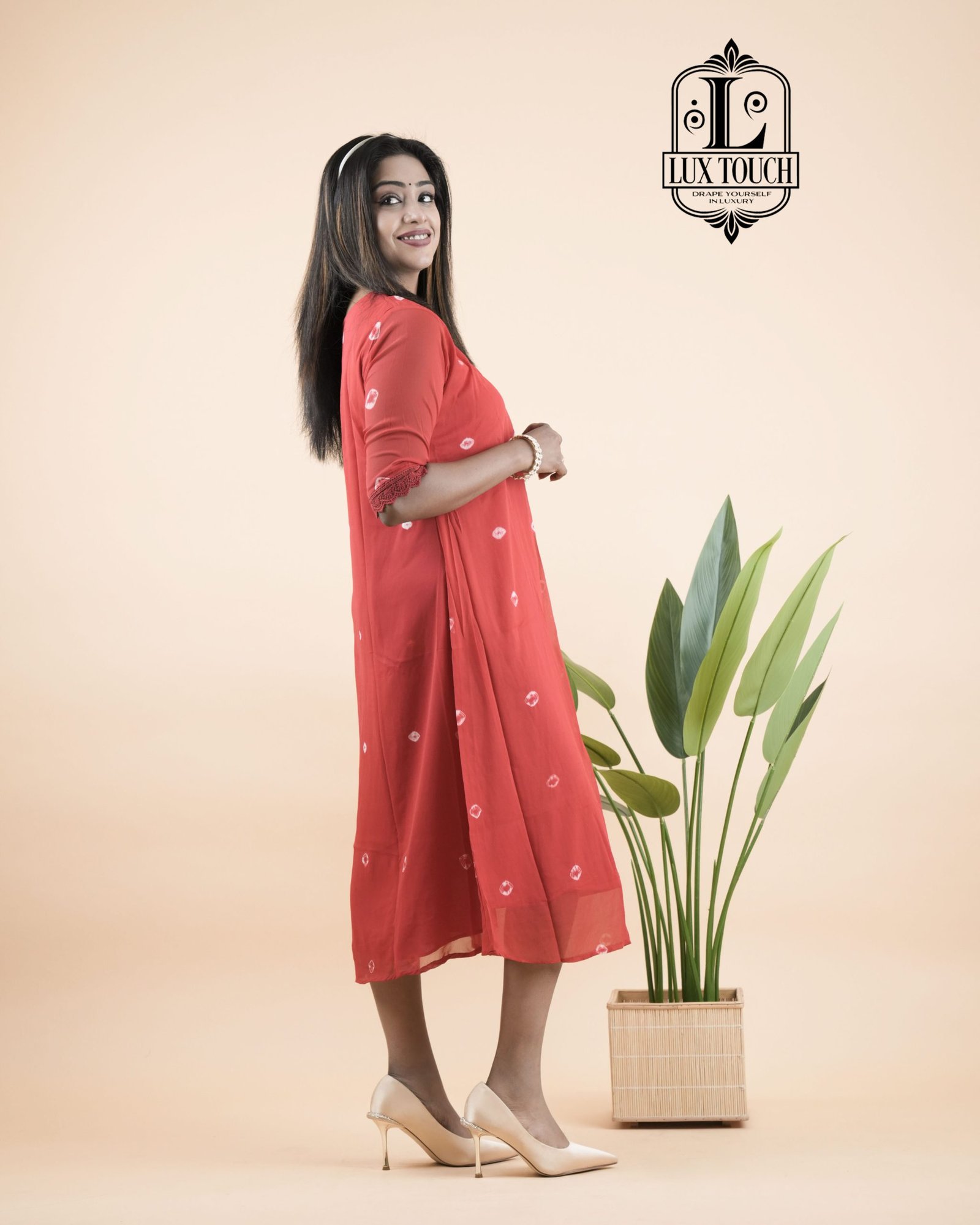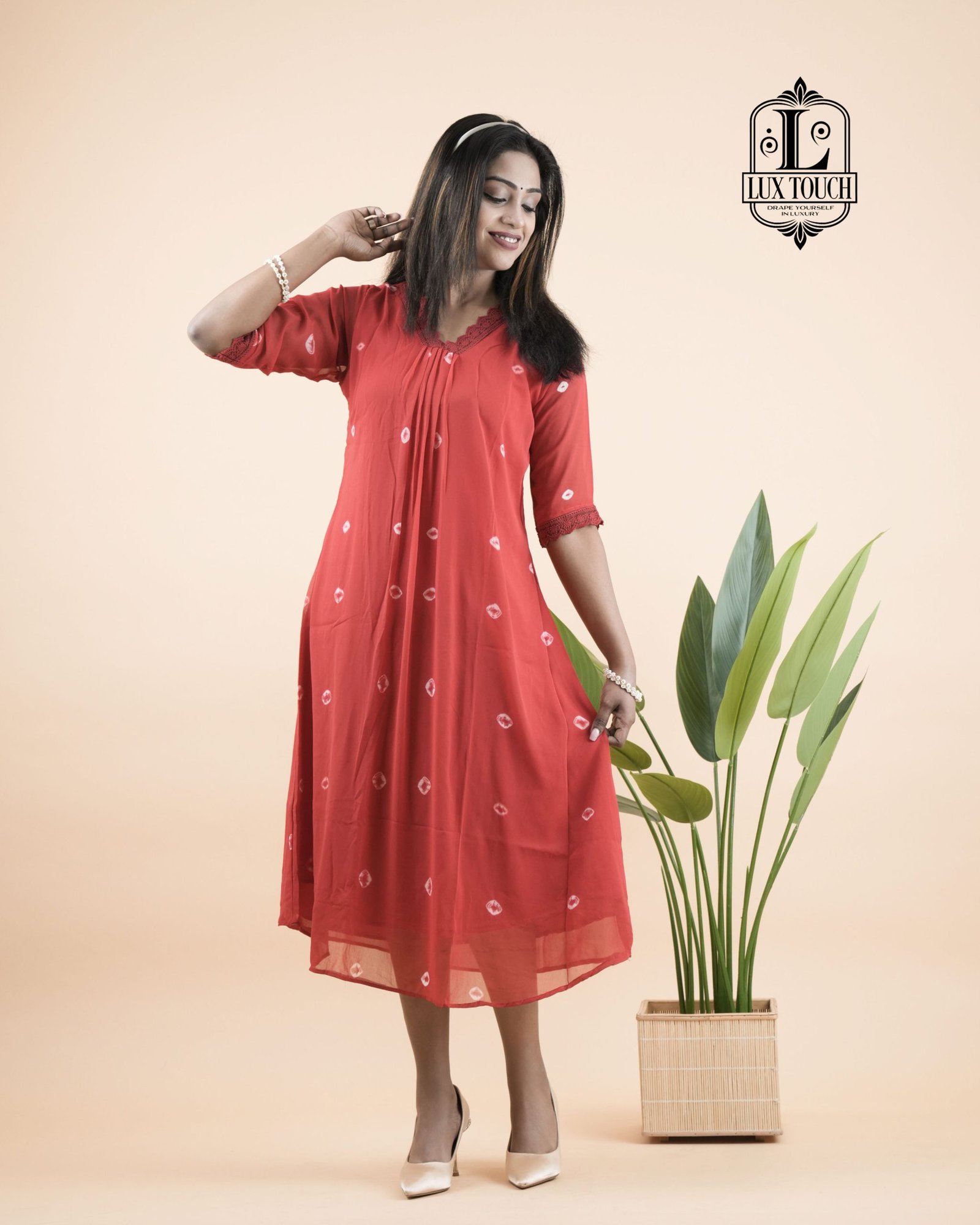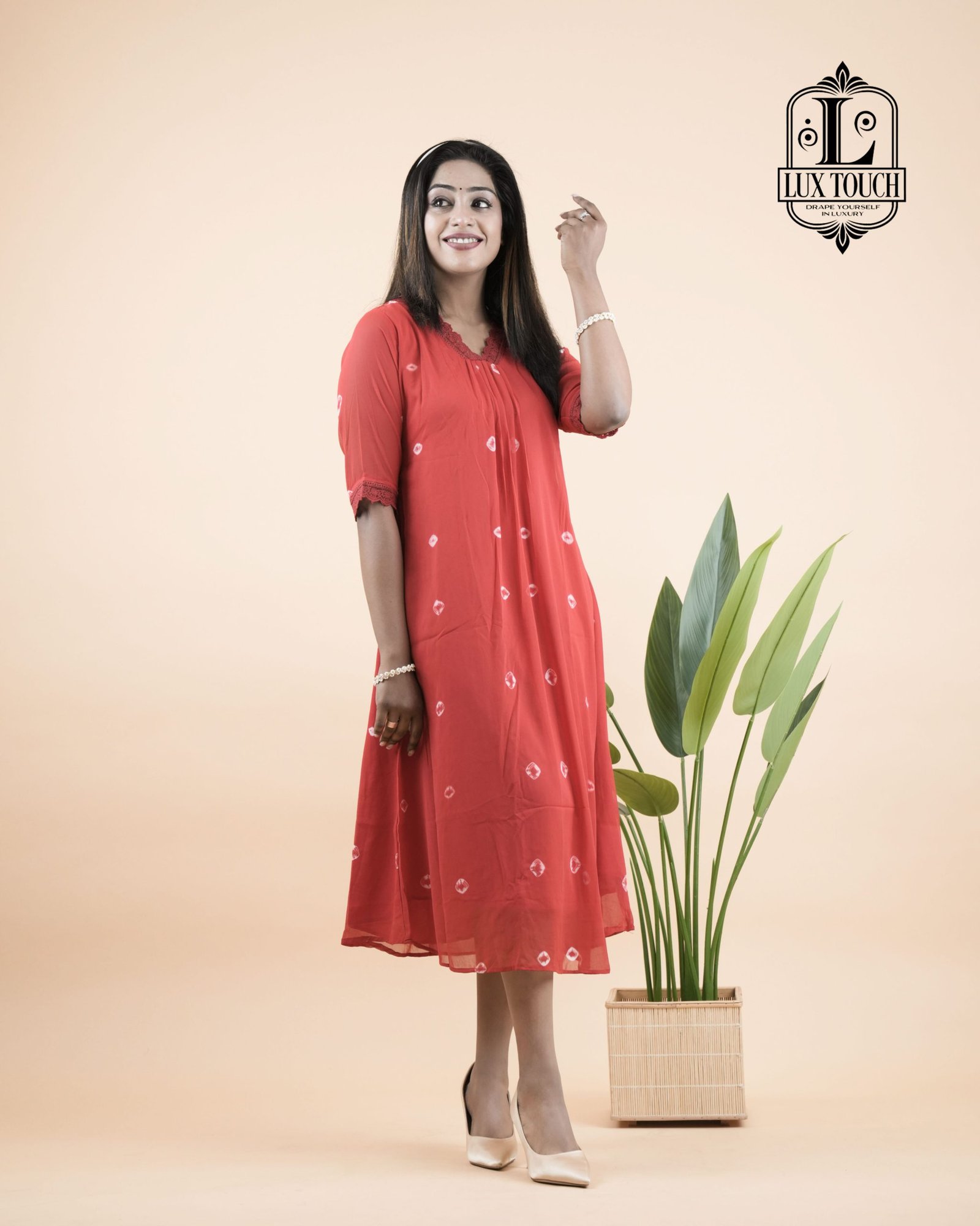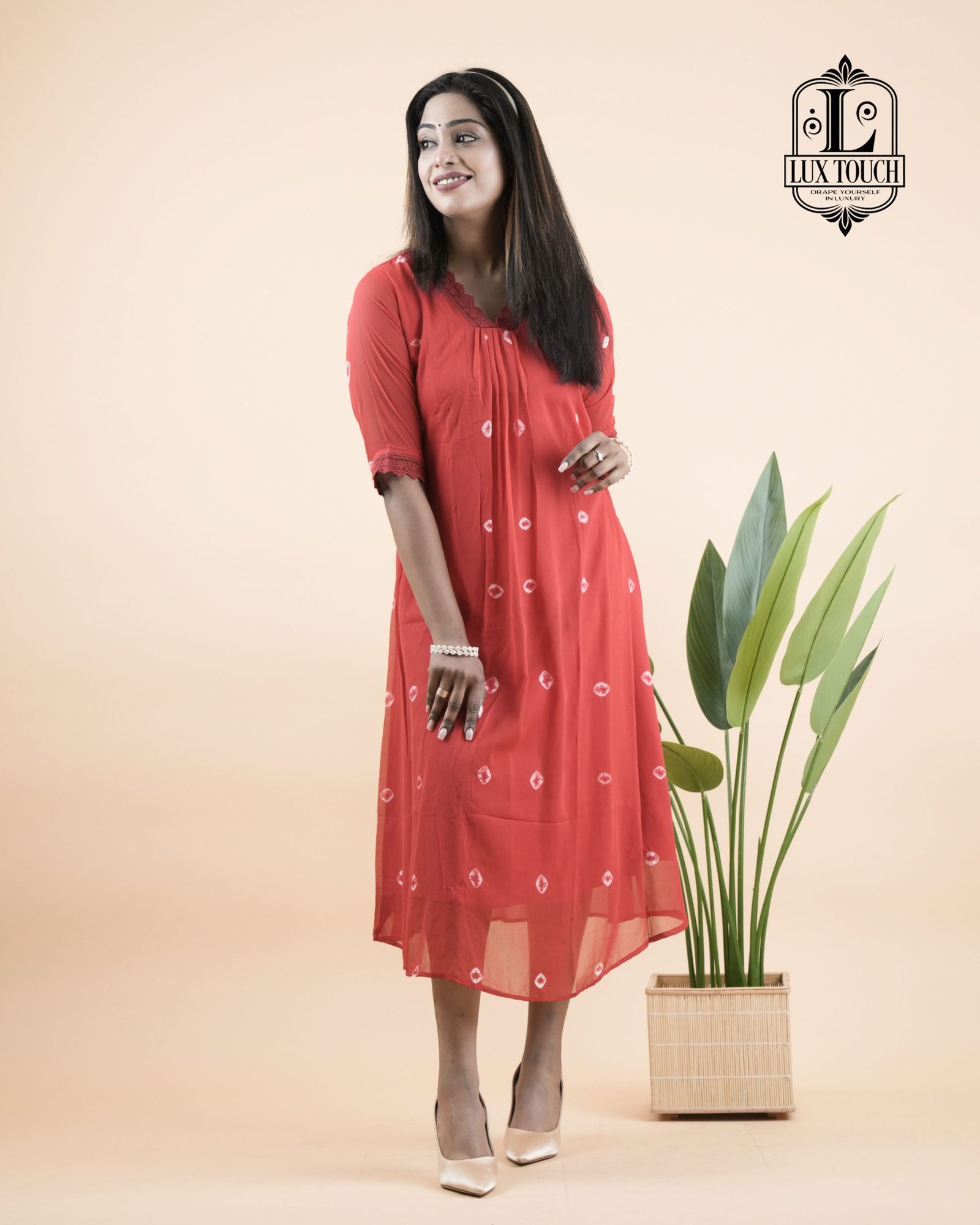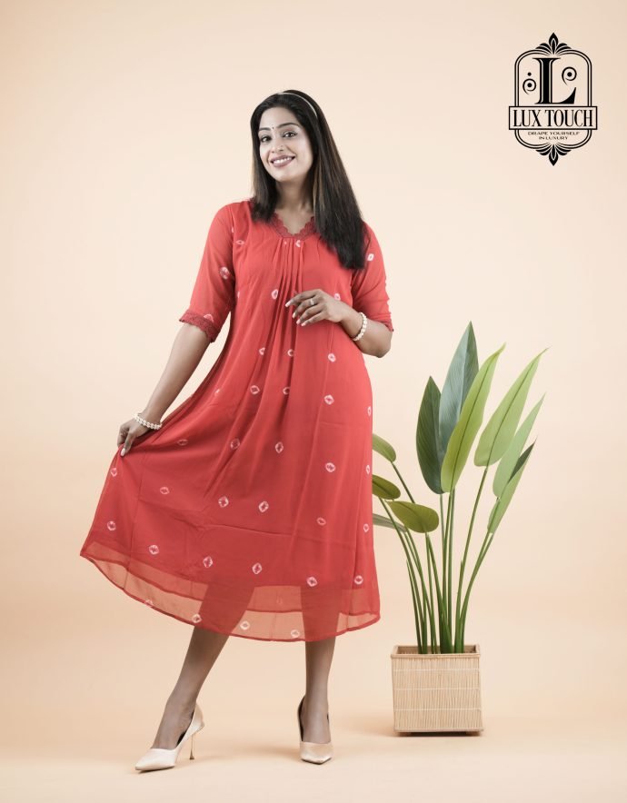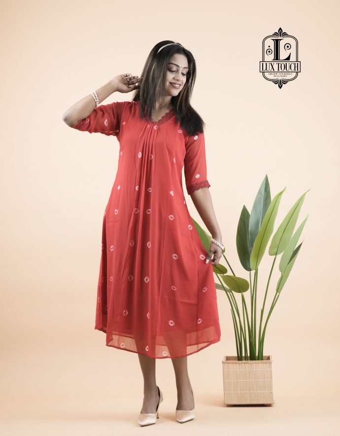 This is a stylish and elegant kurti designed for everyday wear. It features a comfortable A-line silhouette with three-quarter sleeves and a modest neckline, making it suitable for various occasions. The kurti is adorned with a subtle printed pattern that adds a touch of traditional charm while maintaining a modern look. Made from a lightweight and breathable fabric, it ensures ease of movement and comfort throughout the day. Its versatile design makes it ideal for casual outings, work settings, or small gatherings, offering a perfect blend of simplicity and style.