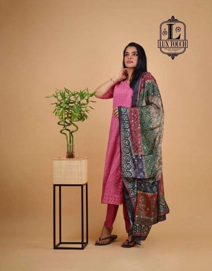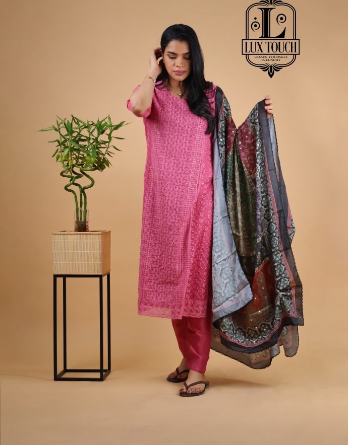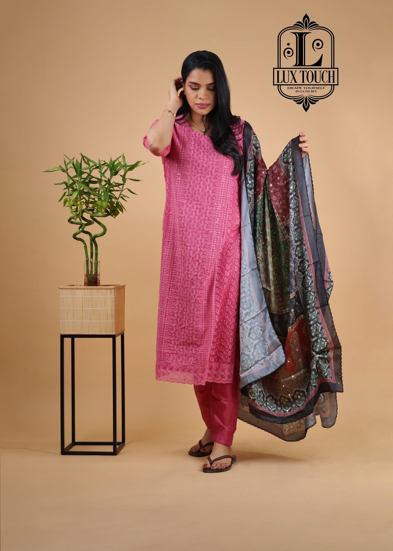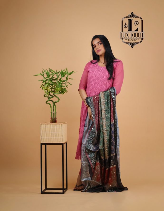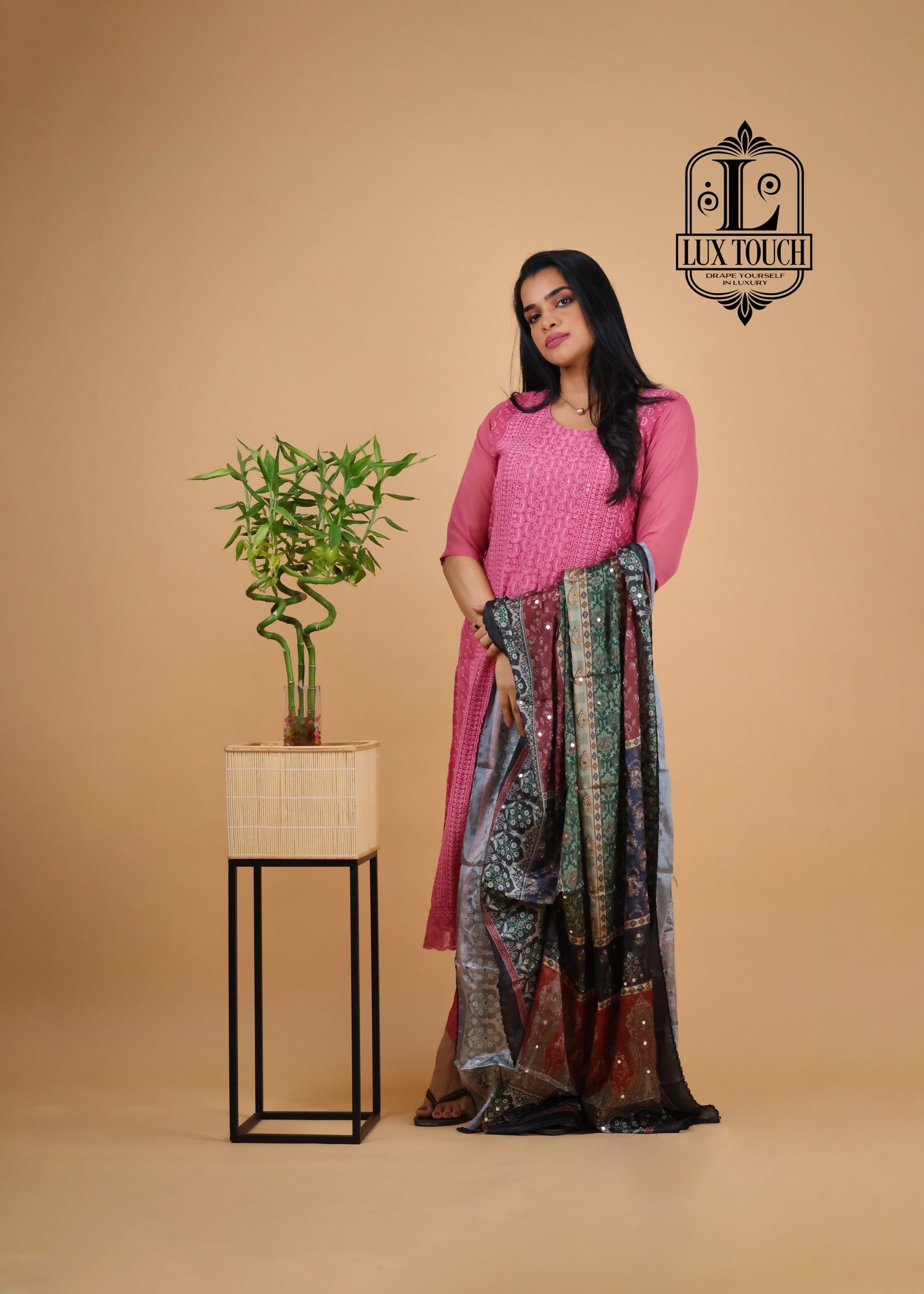 A Chikankari suit with a Pakistani dupatta is an exquisite fusion of two rich and culturally significant textile traditions from South Asia. The combination brings together the delicate, fine craftsmanship of Chikankari embroidery with the luxurious and intricate designs of a Pakistani dupatta, resulting in a stunning, elegant, and regal ensemble suitable for various occasions.