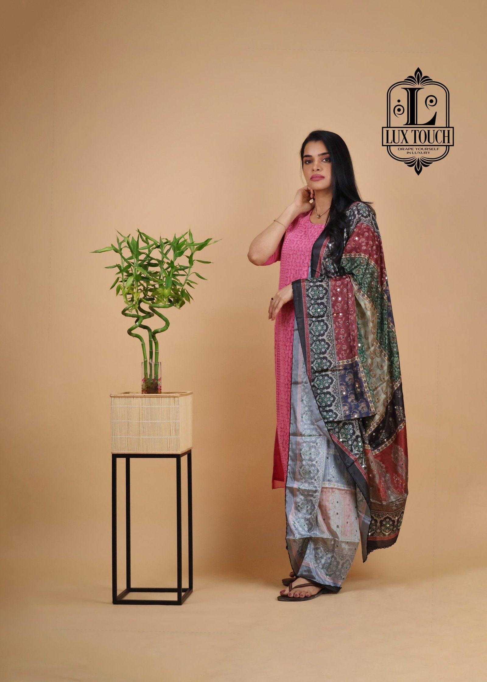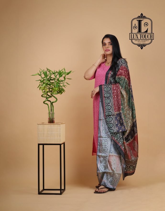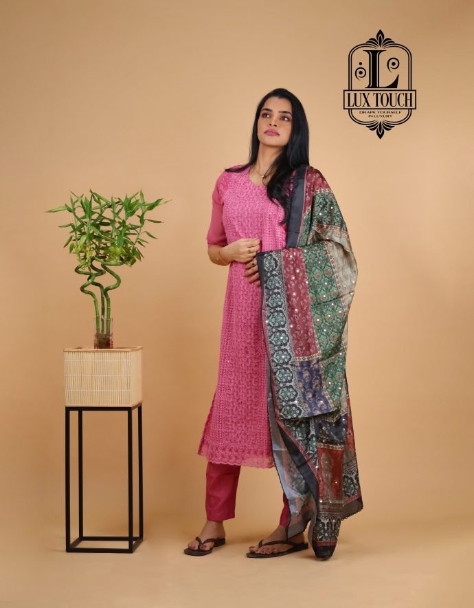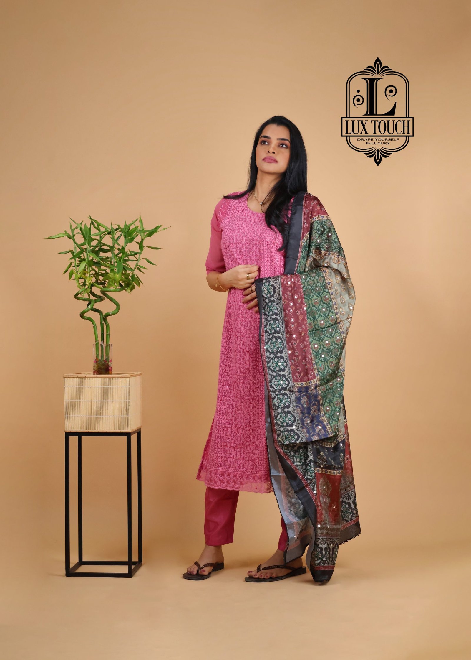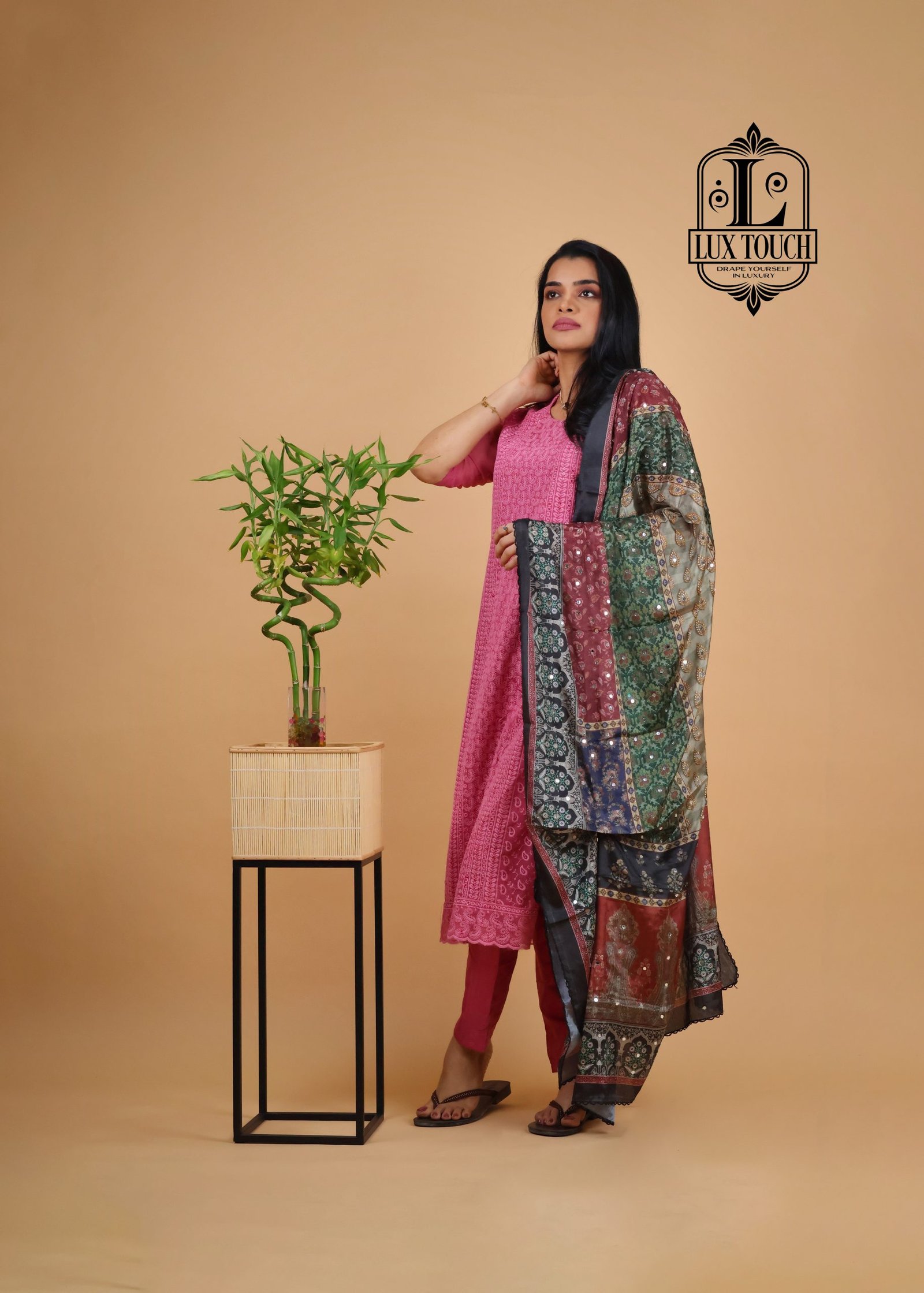 A Chikankari suit with a Pakistani dupatta is an exquisite fusion of two rich and culturally significant textile traditions from South Asia. The combination brings together the delicate, fine craftsmanship of Chikankari embroidery with the luxurious and intricate designs of a Pakistani dupatta, resulting in a stunning, elegant, and regal ensemble suitable for various occasions.