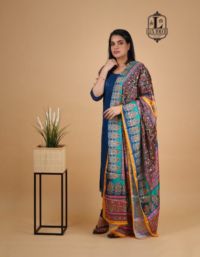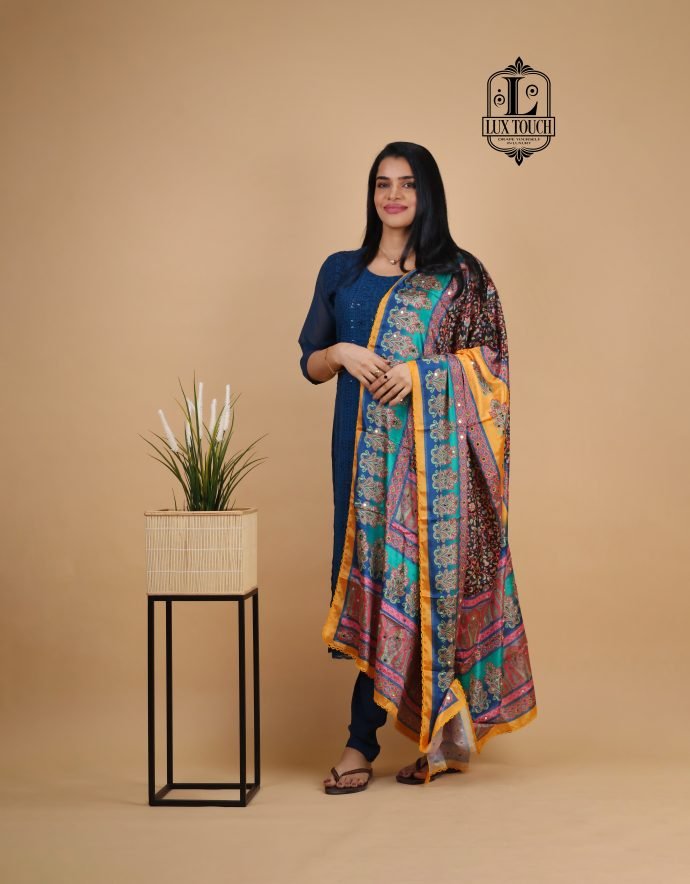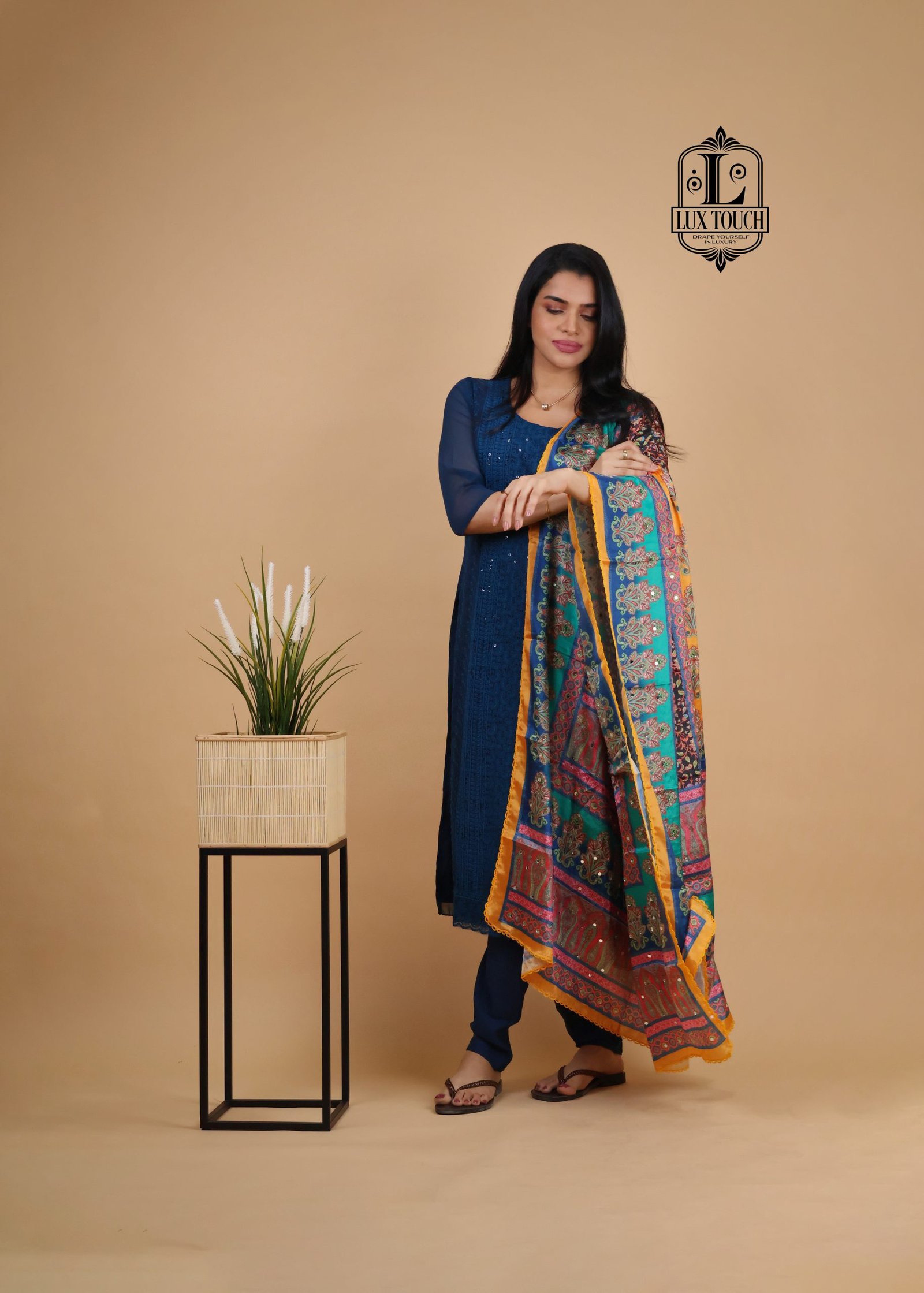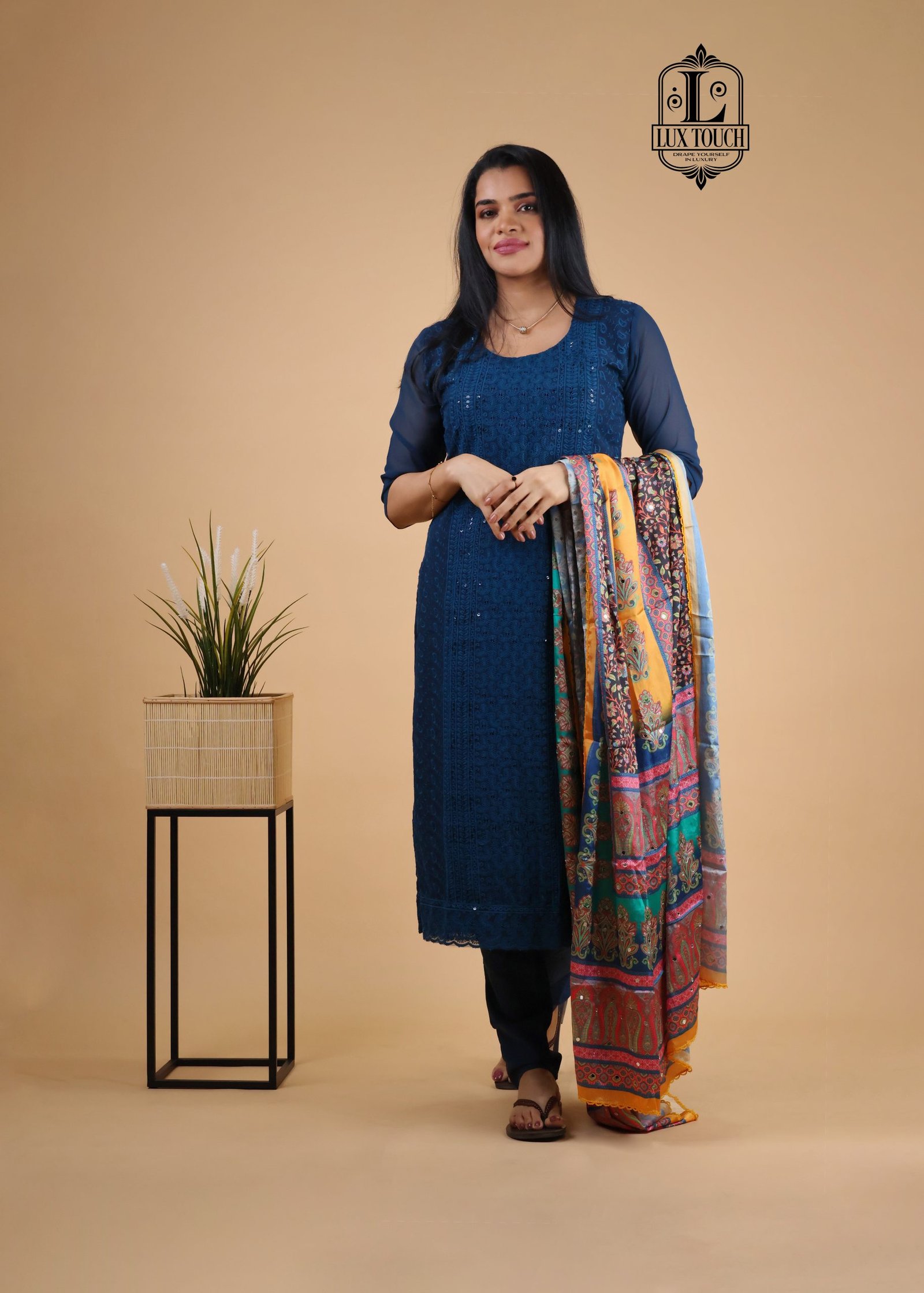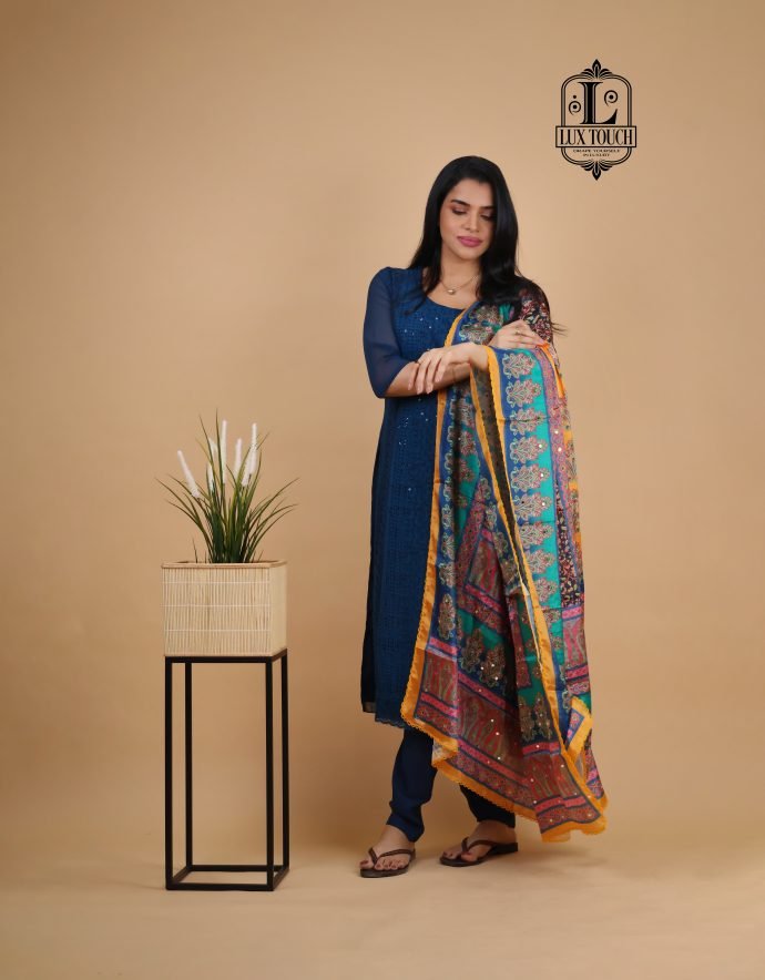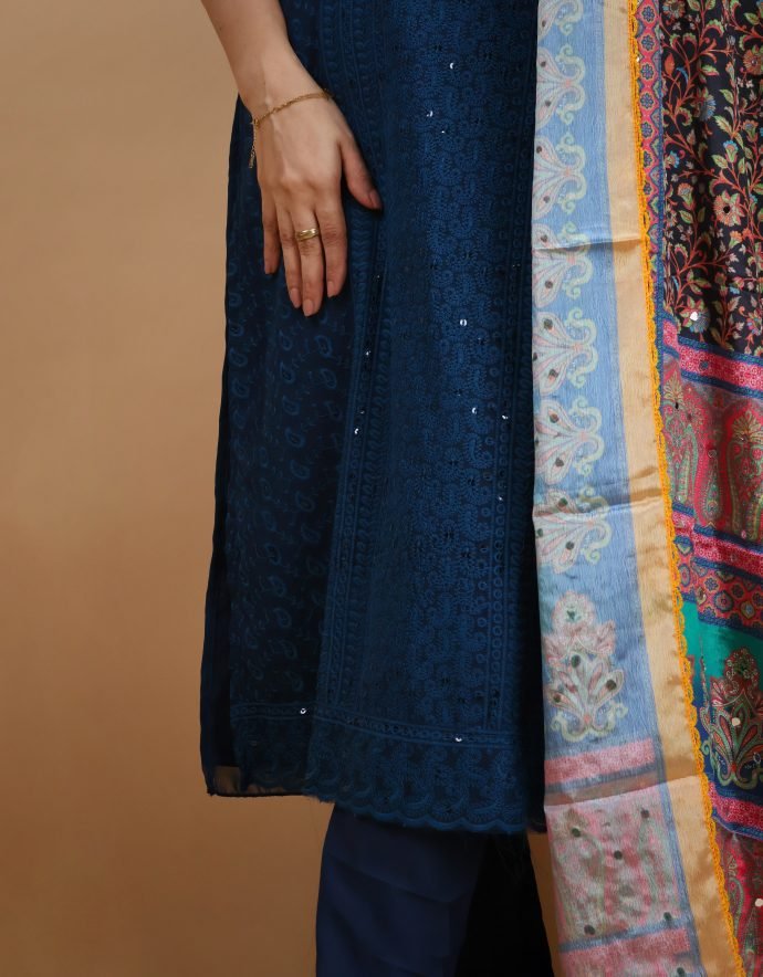 A Chikankari suit with a Pakistani dupatta combines the delicate artistry of Chikankari embroidery with the luxurious appeal of a Pakistani dupatta. This Chikankari suit, typically made ofĀ  georgette, features intricate geometric patterns. The Pakistani dupatta, often crafted from chiffon adds elegance with its rich mirror work. Ā This fusion creates a stunning ensemble, perfect for formal occasions, offering a blend of traditional refinement and vibrant embellishments, with the dupatta adding a bold contrast or complement to the suit.