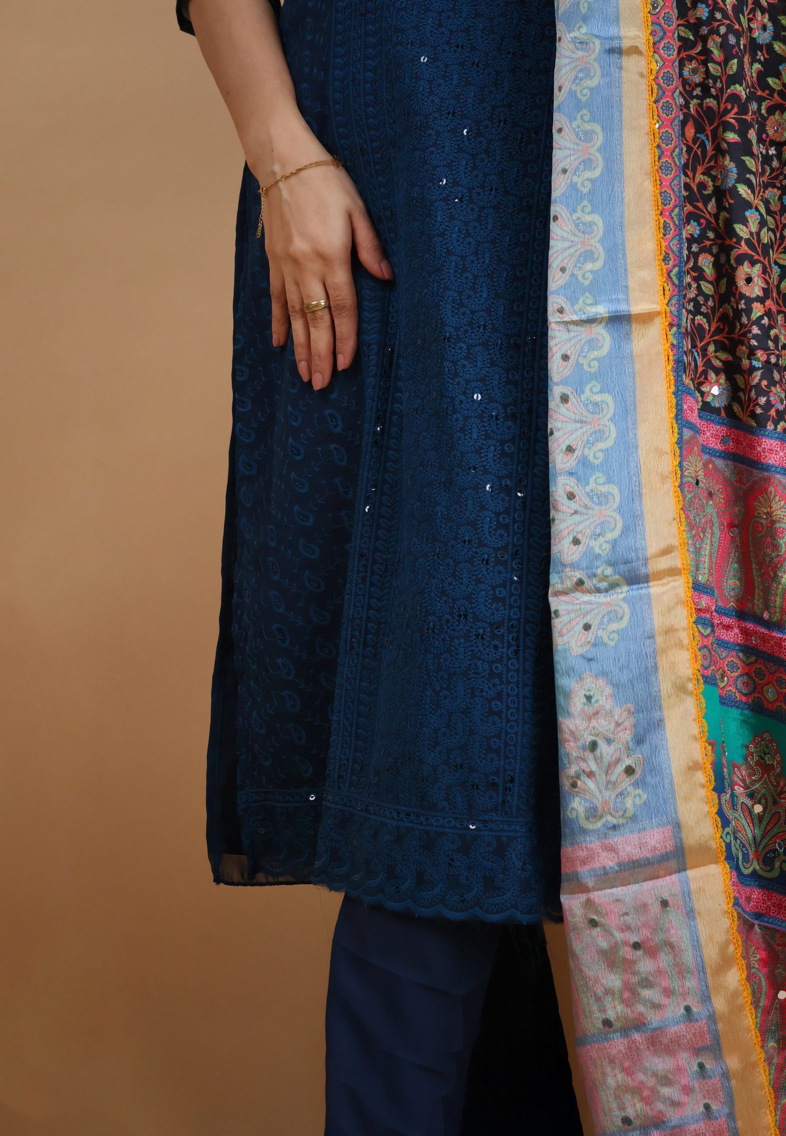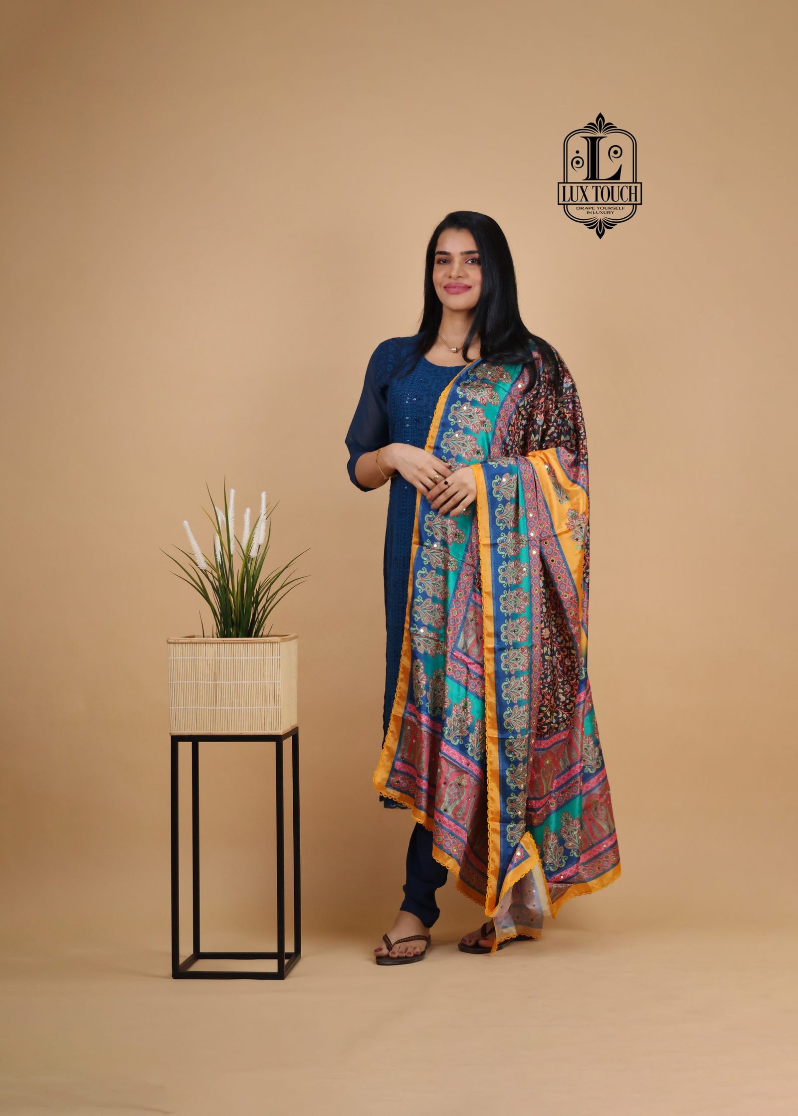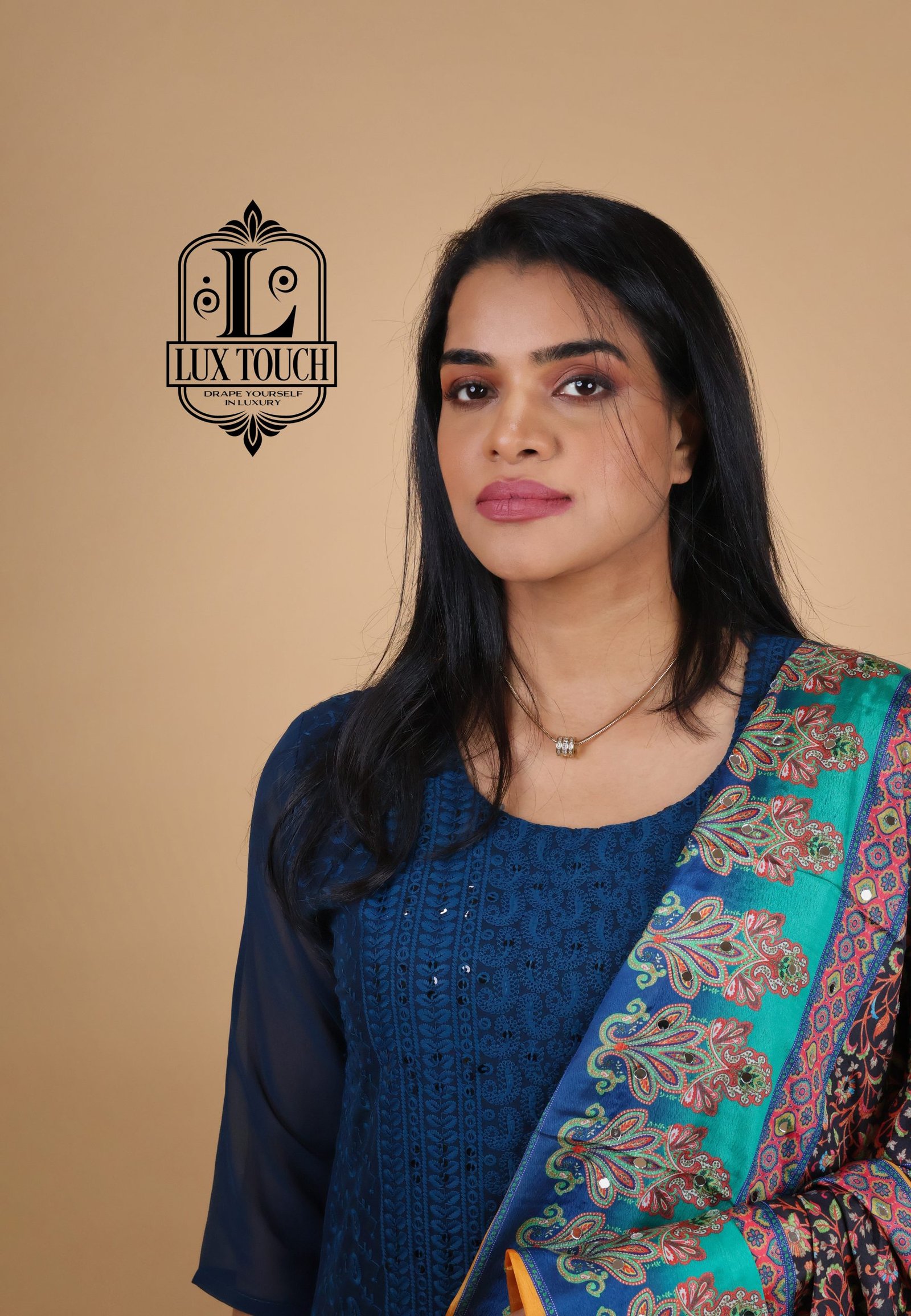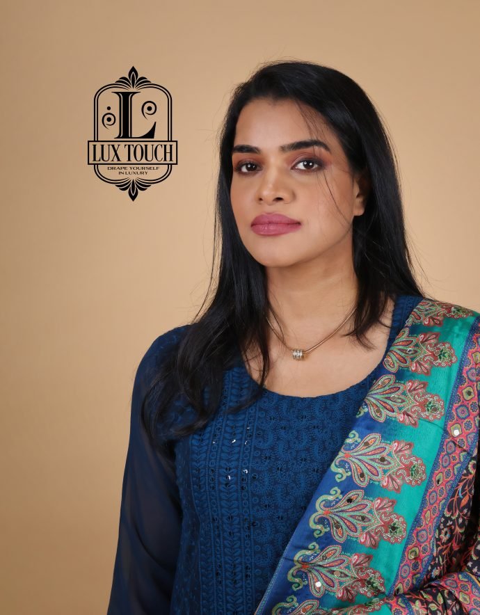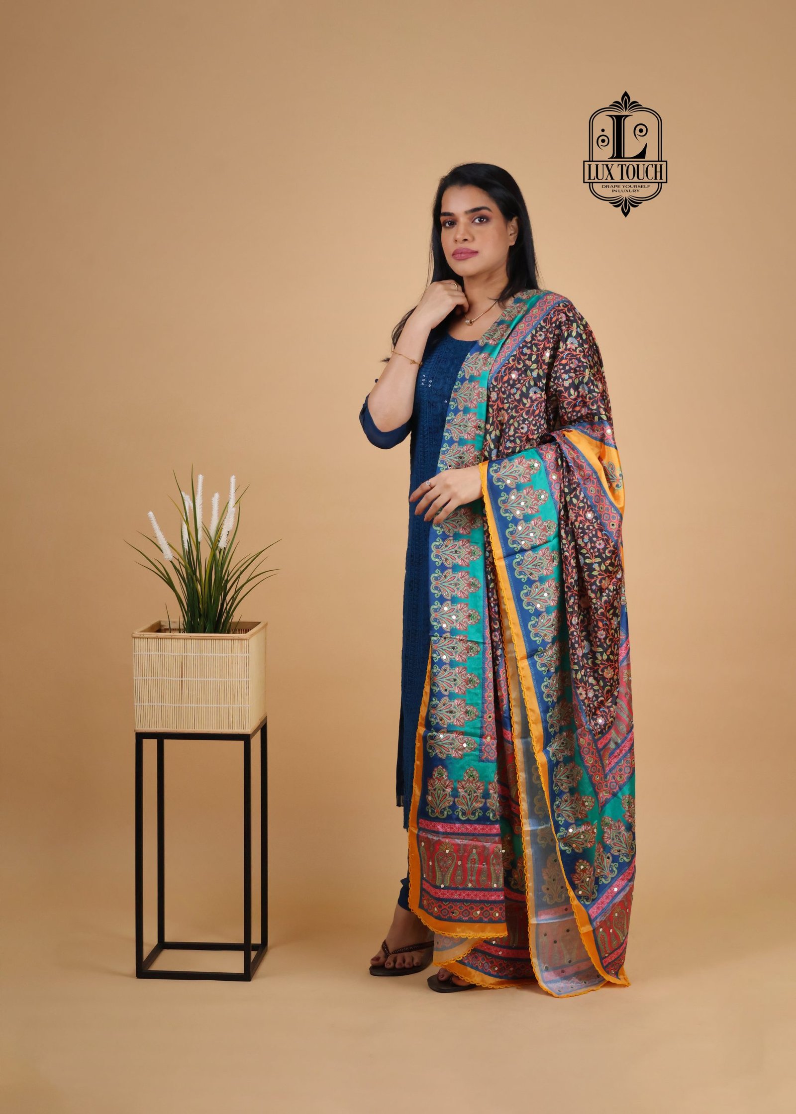 A Chikankari suit with a Pakistani dupatta combines the delicate artistry of Chikankari embroidery with the luxurious appeal of a Pakistani dupatta. This Chikankari suit, typically made ofĀ  georgette, features intricate geometric patterns. The Pakistani dupatta, often crafted from chiffon adds elegance with its rich mirror work. Ā This fusion creates a stunning ensemble, perfect for formal occasions, offering a blend of traditional refinement and vibrant embellishments, with the dupatta adding a bold contrast or complement to the suit.