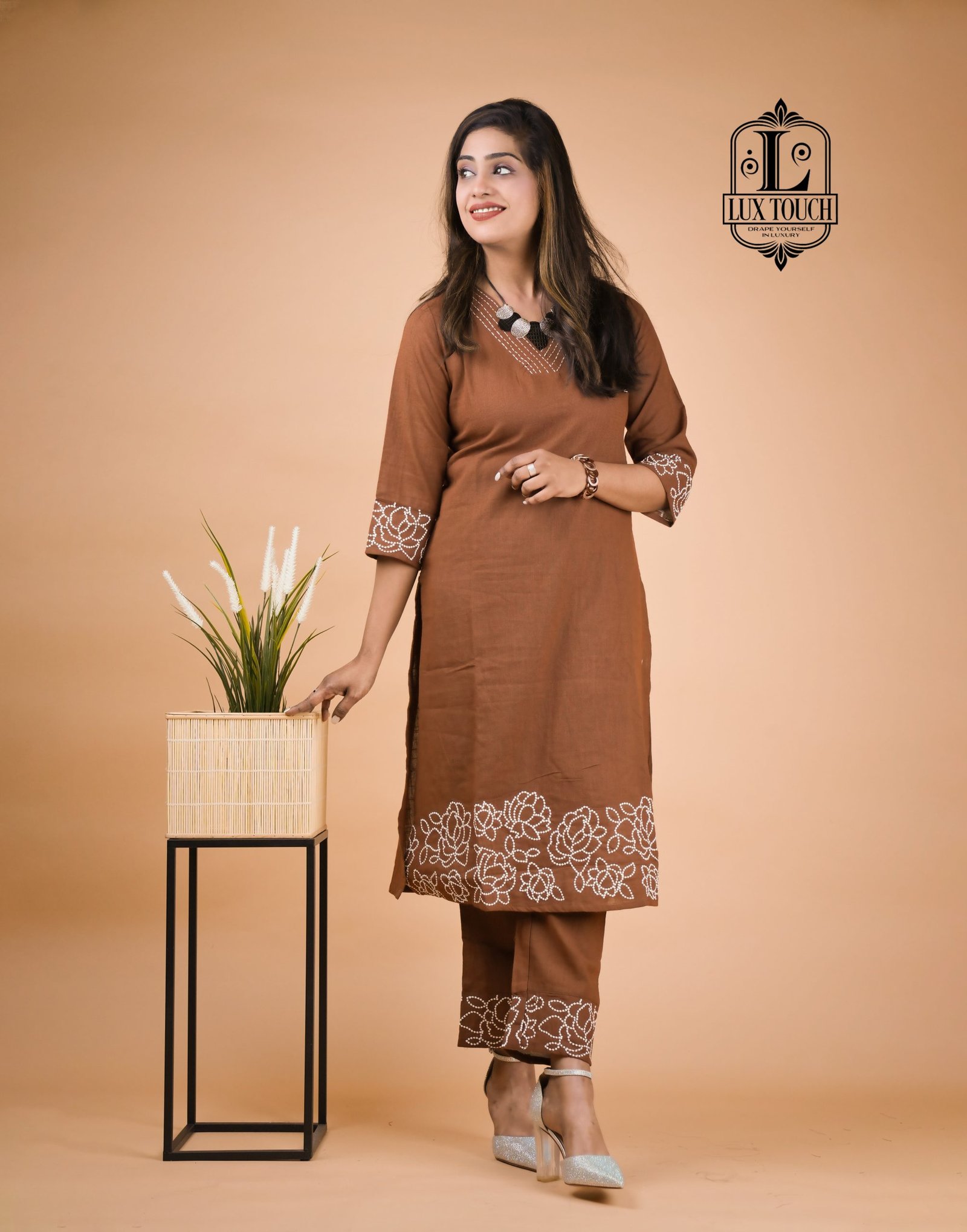Cotton cord set with applique work is a beautifully crafted collection that combines the durability and natural texture of cotton cords with the intricate artistry of applique designs. The cotton cords are often used as the base material, known for their strength and versatility, making them ideal for various applications, including home decor and fashion accessories. The applique work involves sewing or attaching fabric pieces onto the cotton cord base to create detailed patterns or images, such as floral motifs, geometric shapes, or abstract designs. This fusion of textures and techniques results in unique, handcrafted items like wall hangings, table runners, cushion covers, or even bags. The intricate applique work adds a layer of depth and elegance, making these sets perfect for those seeking to add a personalized, artistic touch to their space or wardrobe.