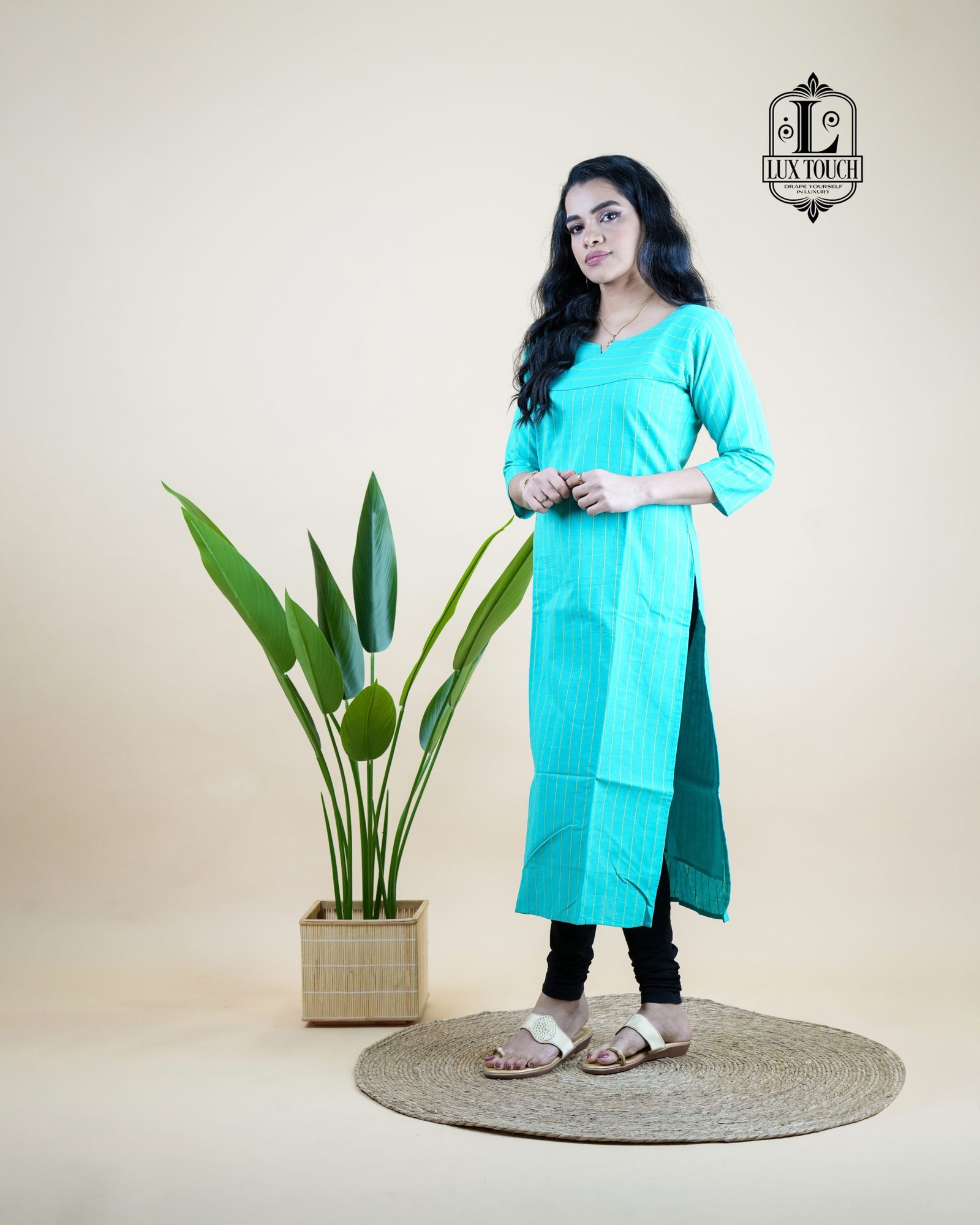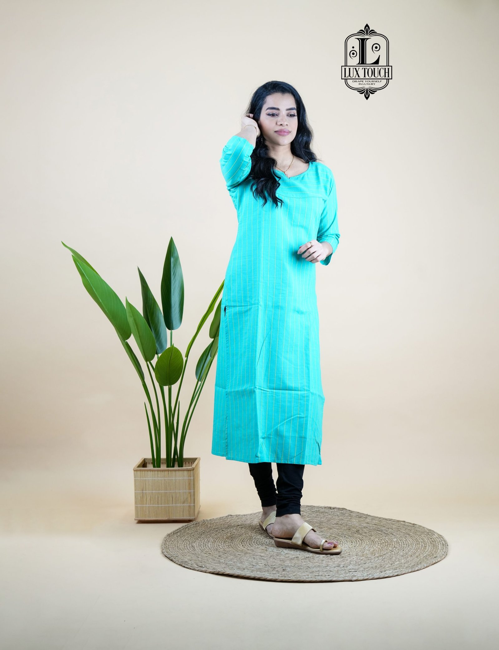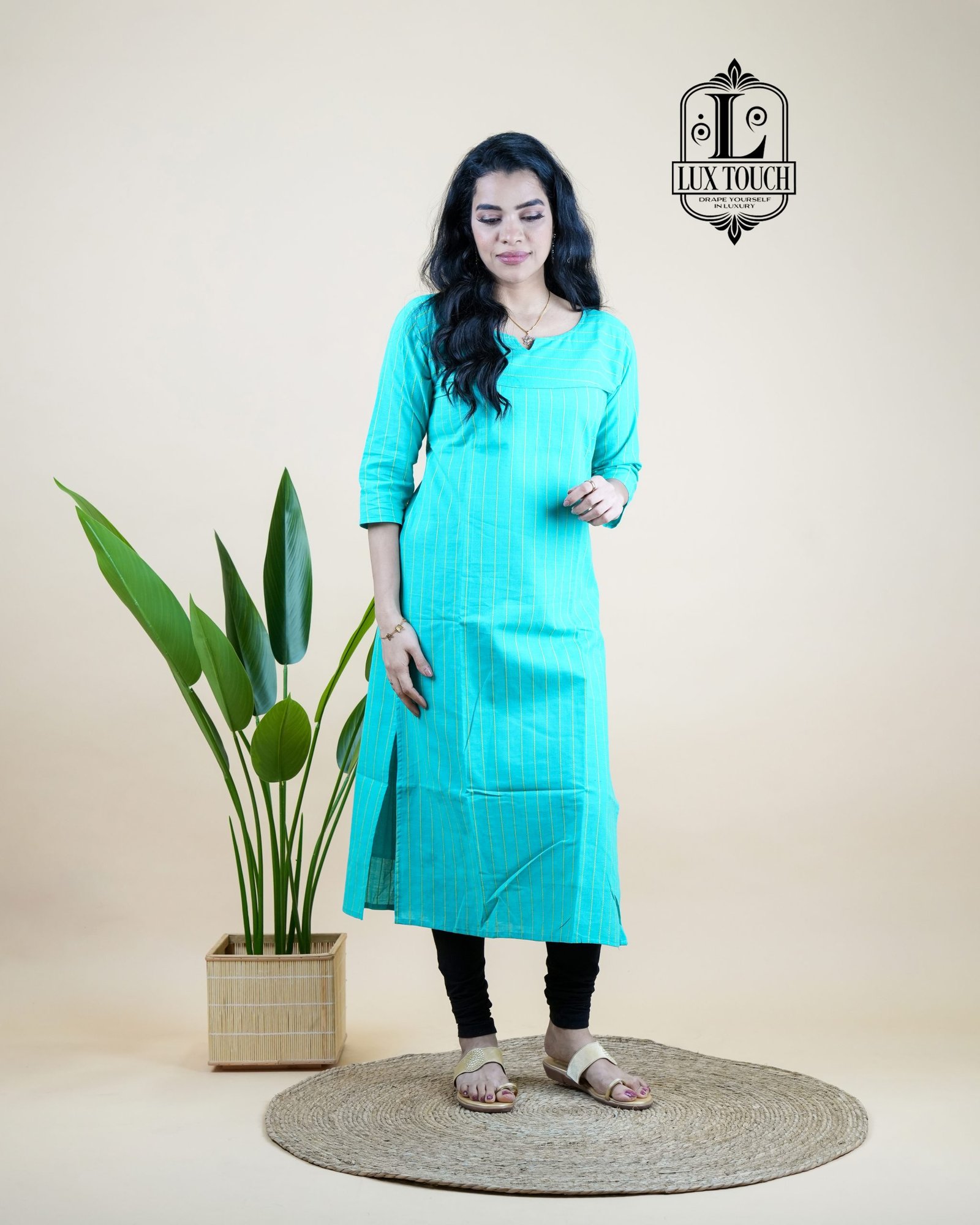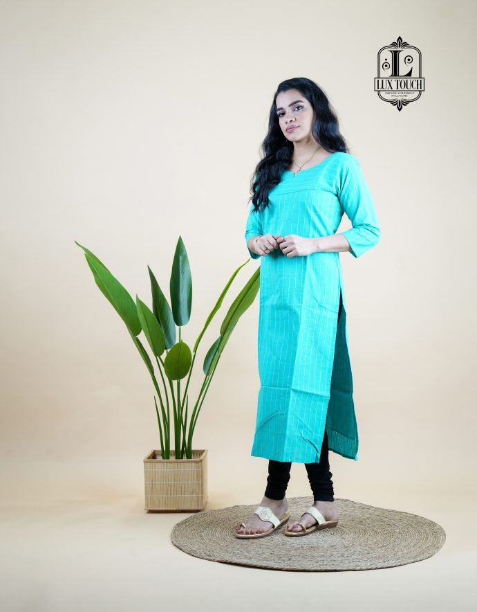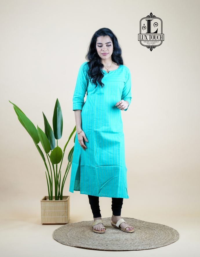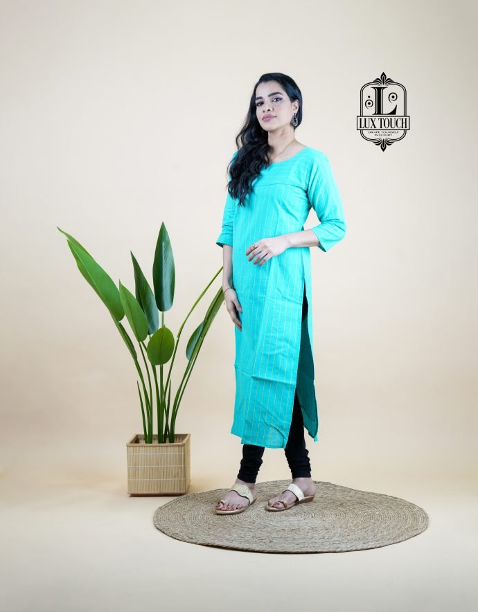 “This stylish cotton kurti features classic vertical stripes that add a touch of elegance and elongate the silhouette. Made from soft, breathable cotton fabric, it ensures all-day comfort, making it ideal for both casual outings and daily wear. The straight-cut design offers a relaxed yet flattering fit, while subtle detailing at the neckline or sleeves (if any) adds to its charm. Pair it with leggings, jeans, or palazzos for a versatile and chic look.”