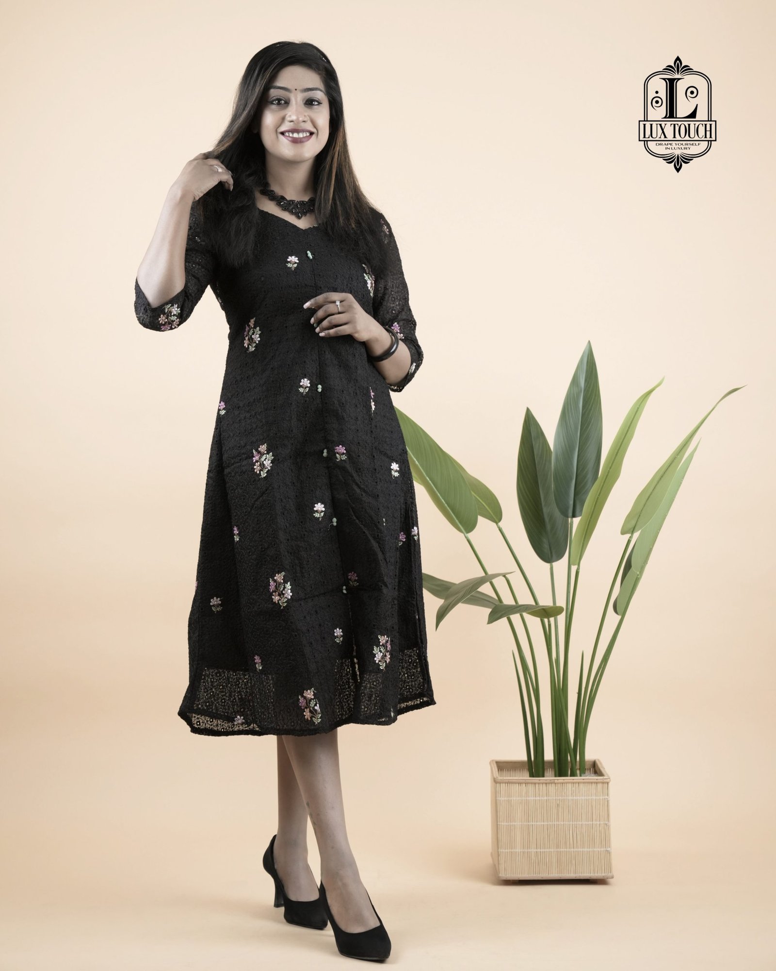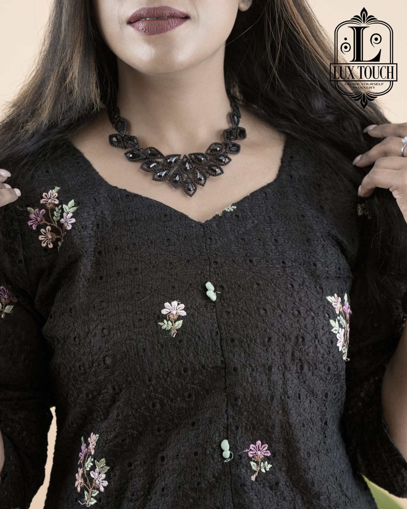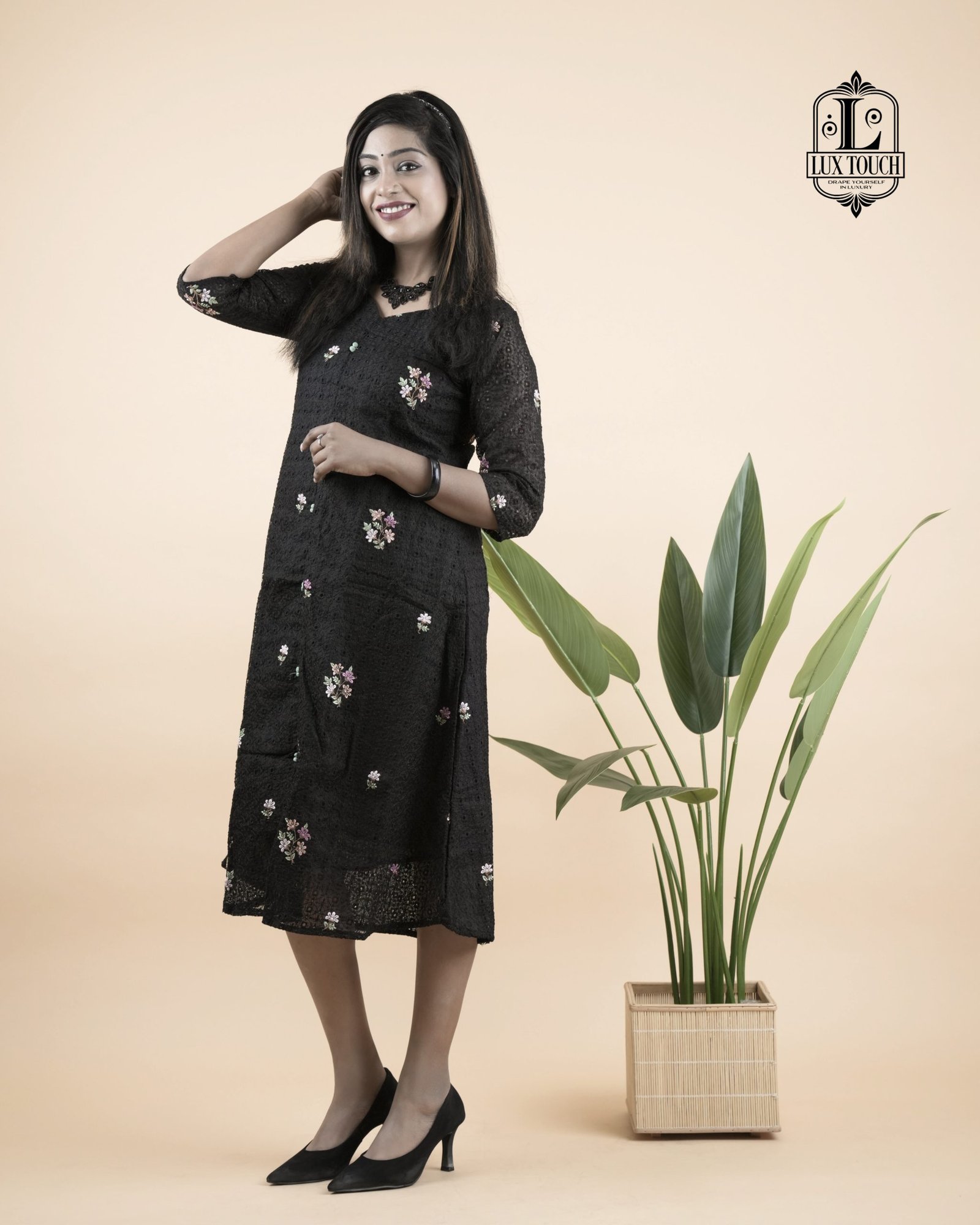 Chic black knee-length kurti featuring delicate floral embroidery in soft pastel shades. The fabric has a subtle textured pattern, adding depth to its look. It has three-quarter sleeves and a comfortable A-line fit, perfect for both casual and semi-formal occasions. The lightweight material and minimal design offer an elegant yet understated style.