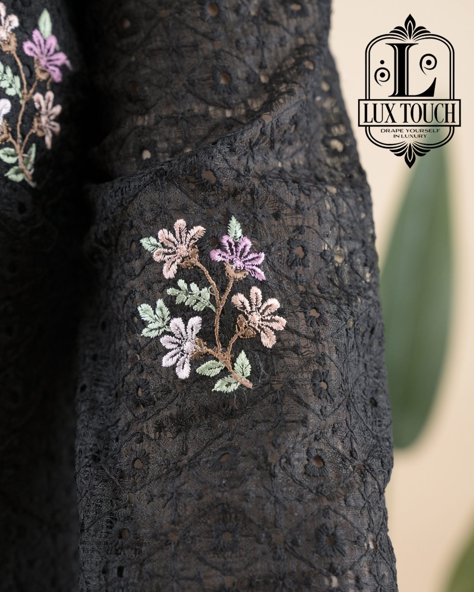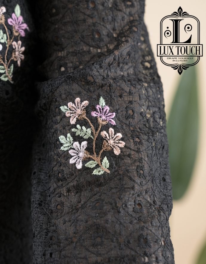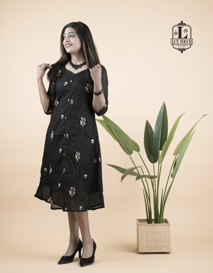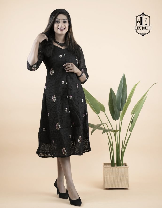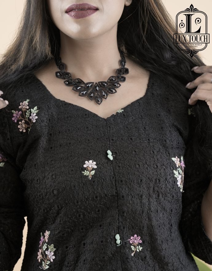 Chic black knee-length kurti featuring delicate floral embroidery in soft pastel shades. The fabric has a subtle textured pattern, adding depth to its look. It has three-quarter sleeves and a comfortable A-line fit, perfect for both casual and semi-formal occasions. The lightweight material and minimal design offer an elegant yet understated style.