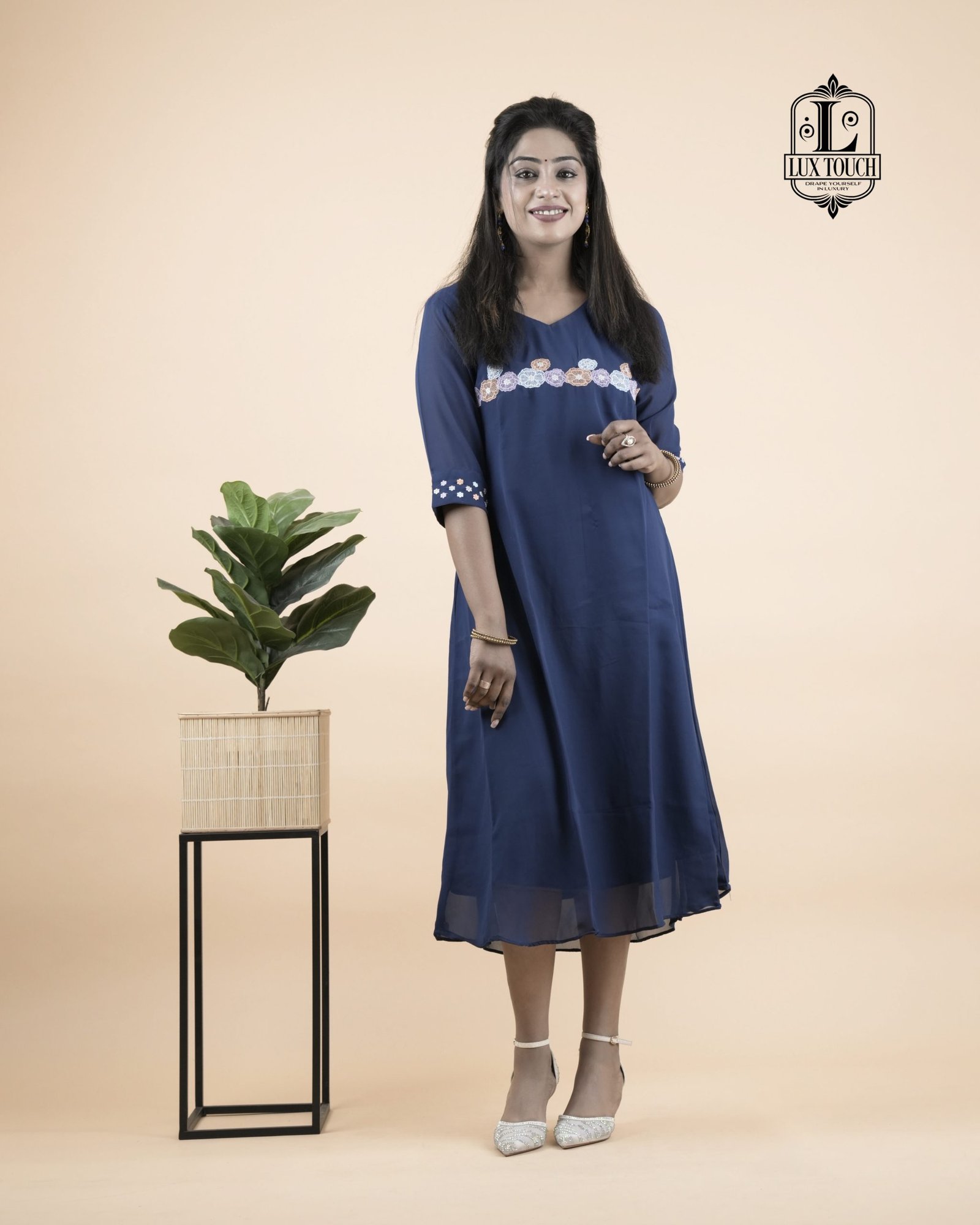 The dress in the image is a graceful navy blue A-line outfit that falls just below the knees, offering a modest yet stylish appearance. It features three-quarter sleeves adorned with delicate white embroidery near the elbows, adding a touch of elegance without being overly ornate. A matching band of white embroidery also runs horizontally across the chest, creating a balanced and eye-catching detail. The fabric appears to be lightweight and flowy, possibly georgette or chiffon, with a lining to ensure comfort and opacity. The dress has a simple round neckline and a clean, straight hemline, making it suitable for both casual and semi-formal occasions.