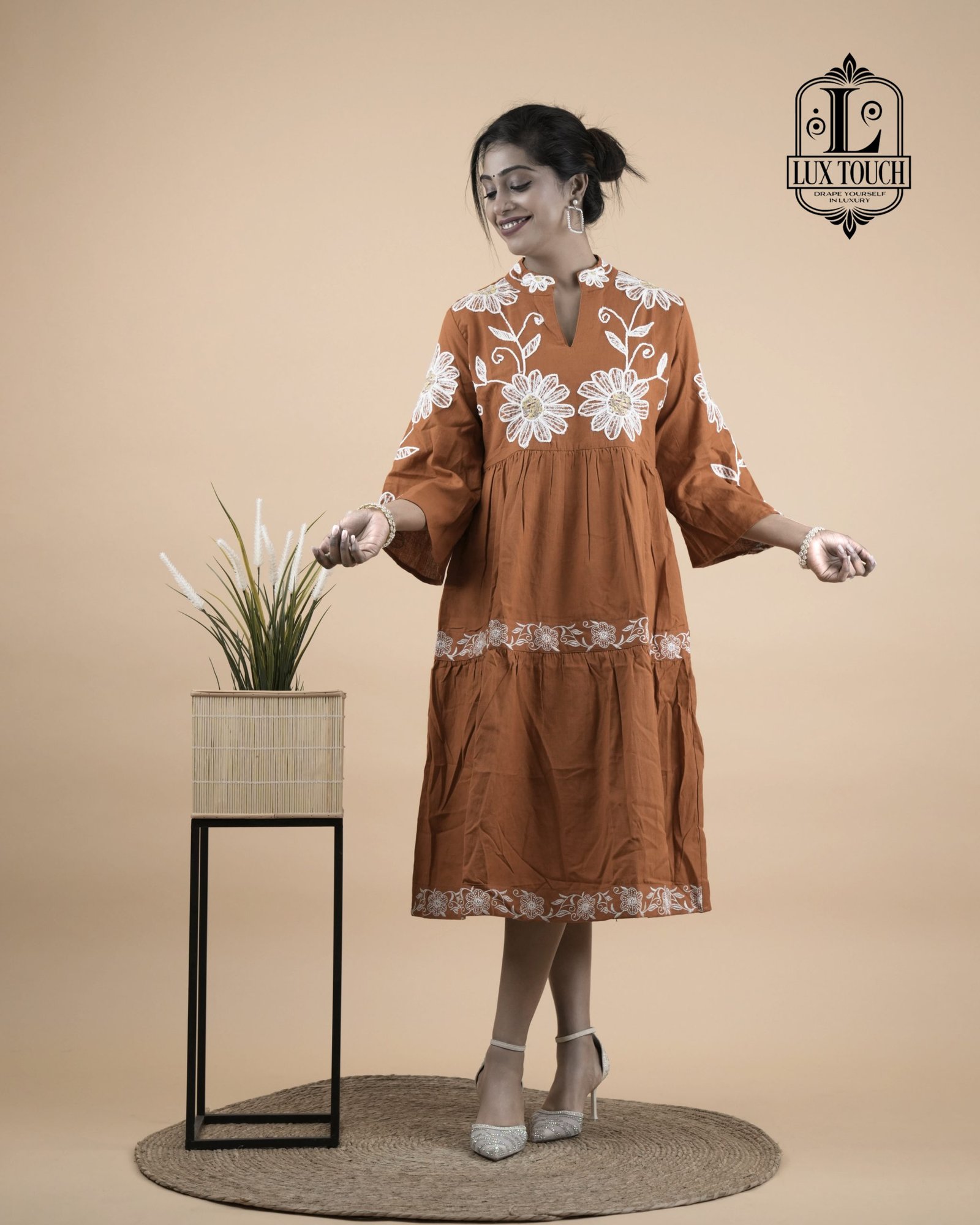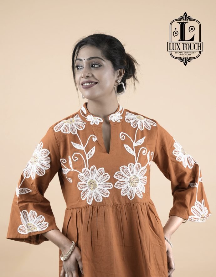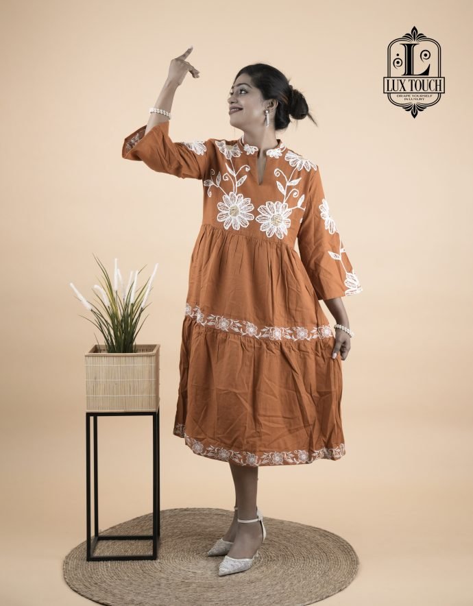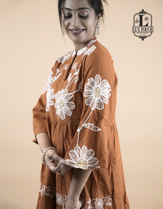 Charming and traditional rust-orange flared outfit with a feminine and festive touch. It features a high round neckline and three-quarter sleeves, both adorned with white embroidered detailing that adds a refined contrast to the warm base color. The bodice is enhanced with prominent circular white floral motifs, creating a statement design element. A decorative belt tied into a bow at the back gives the dress a flattering shape and adds an element of grace. The skirt portion is tiered and bordered with white embroidery, contributing to a playful yet elegant flair. Crafted from a light, breathable fabric, the dress exudes a blend of ethnic charm and contemporary style, making it ideal for festive gatherings or special occasions.