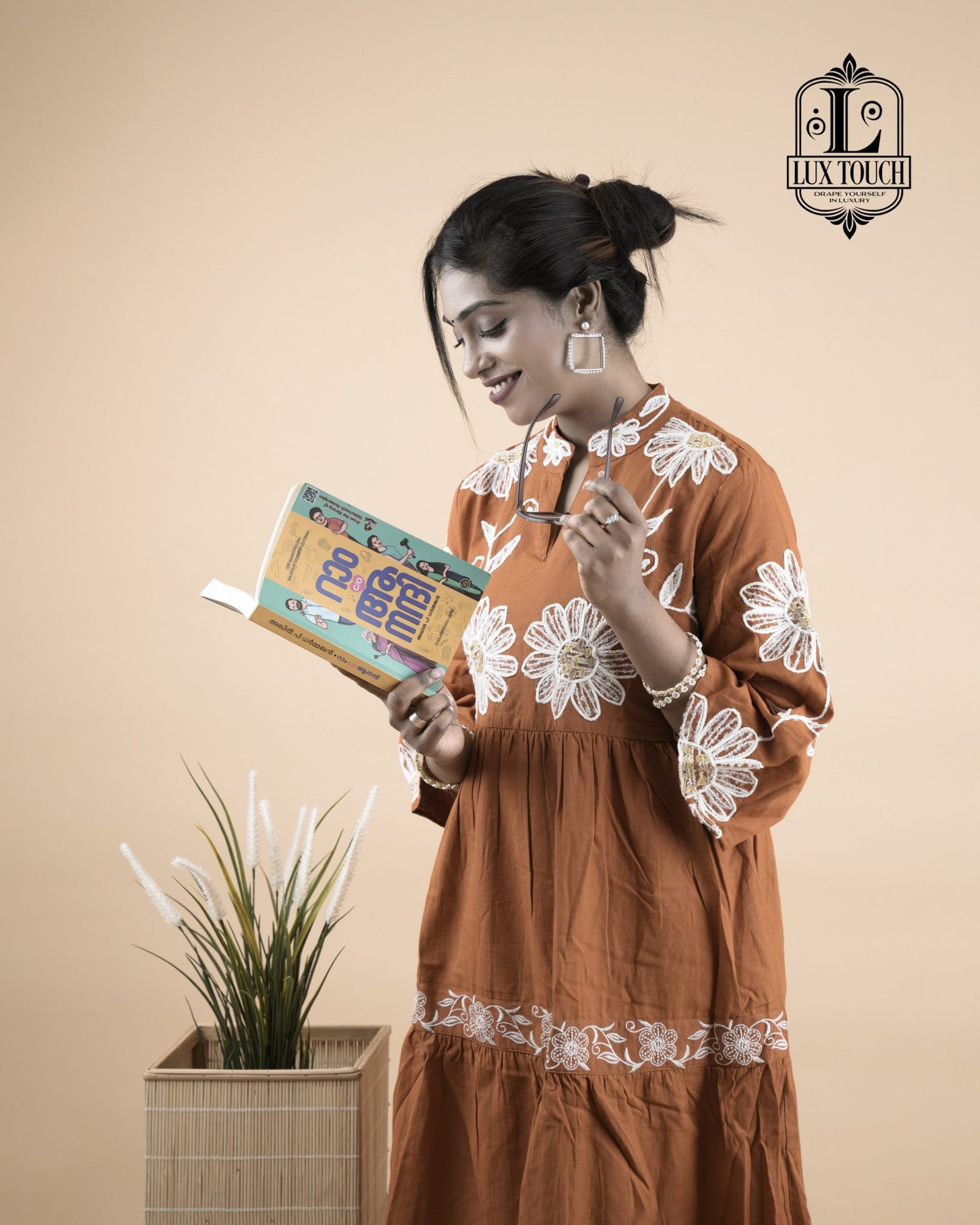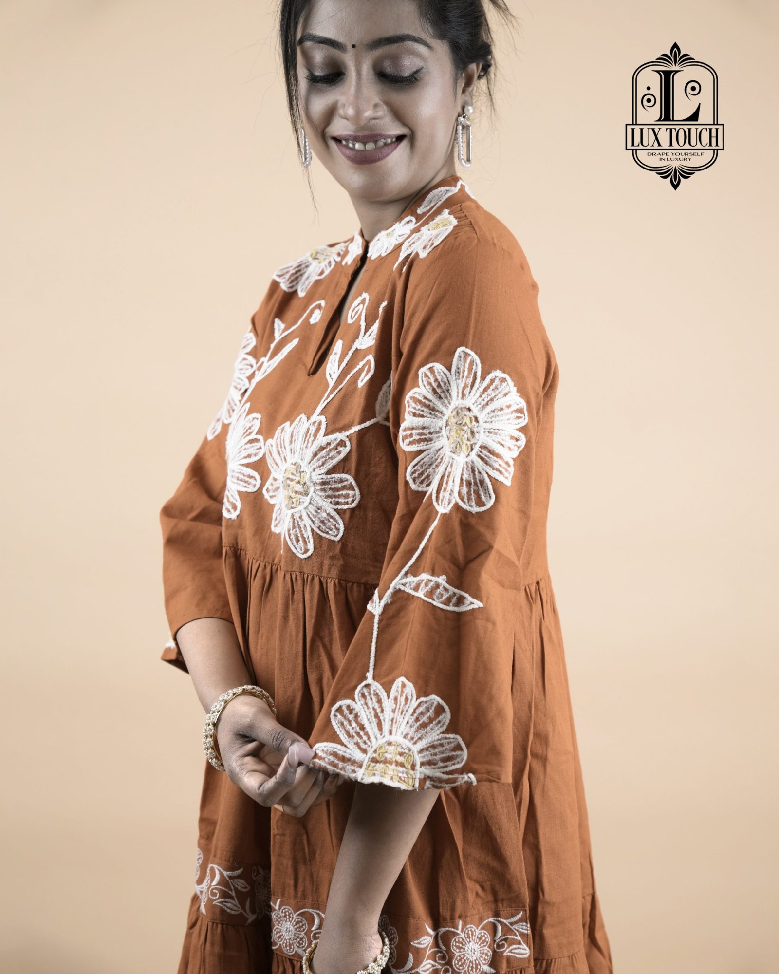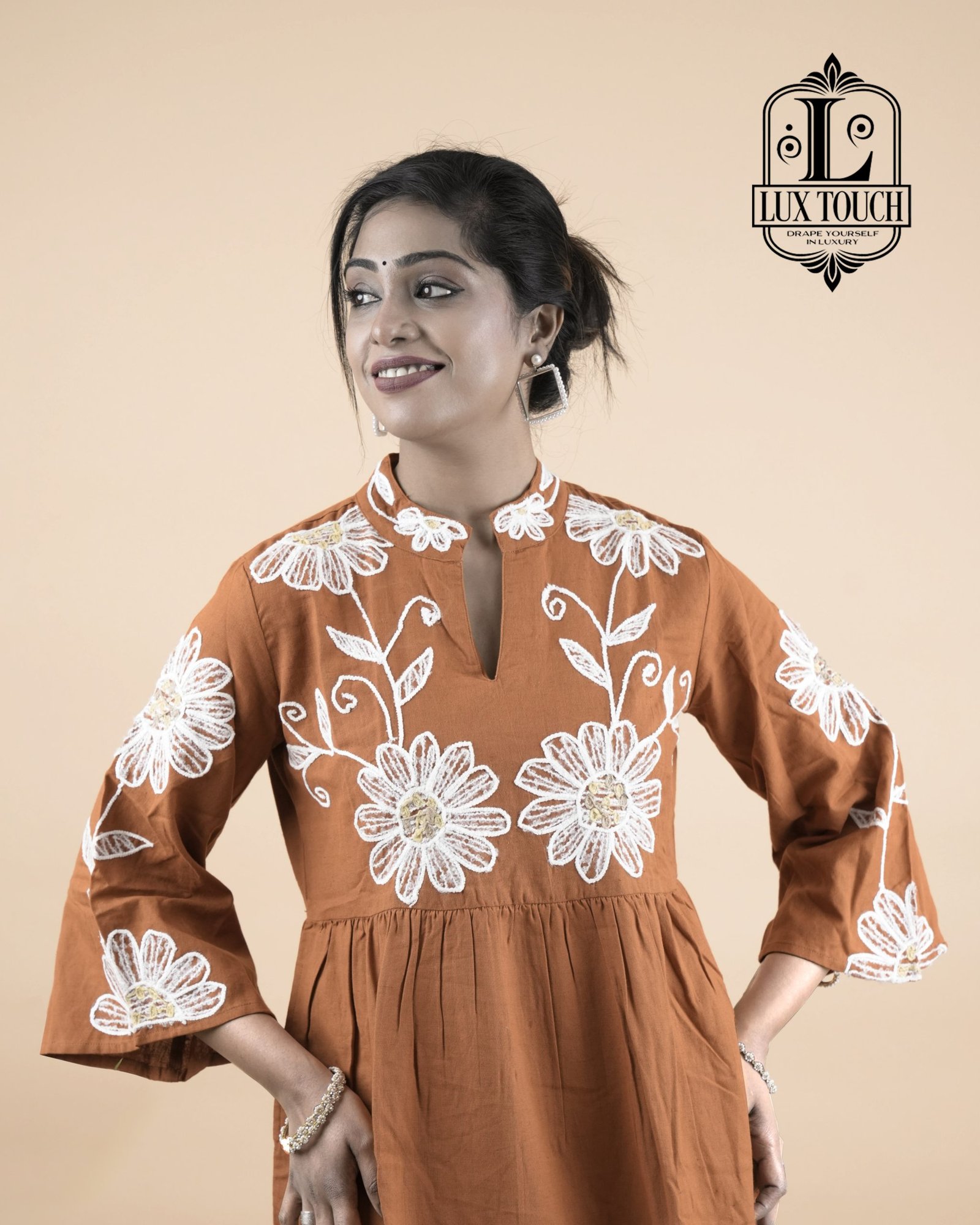 Charming and traditional rust-orange flared outfit with a feminine and festive touch. It features a high round neckline and three-quarter sleeves, both adorned with white embroidered detailing that adds a refined contrast to the warm base color. The bodice is enhanced with prominent circular white floral motifs, creating a statement design element. A decorative belt tied into a bow at the back gives the dress a flattering shape and adds an element of grace. The skirt portion is tiered and bordered with white embroidery, contributing to a playful yet elegant flair. Crafted from a light, breathable fabric, the dress exudes a blend of ethnic charm and contemporary style, making it ideal for festive gatherings or special occasions.