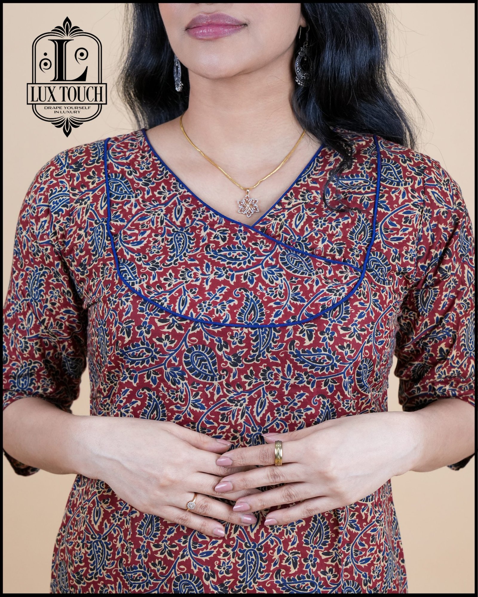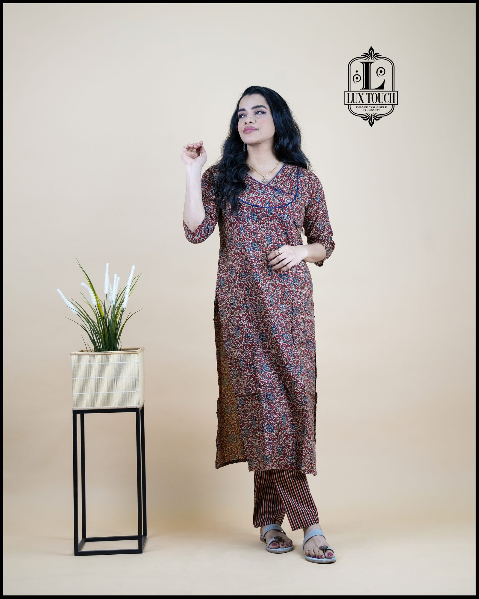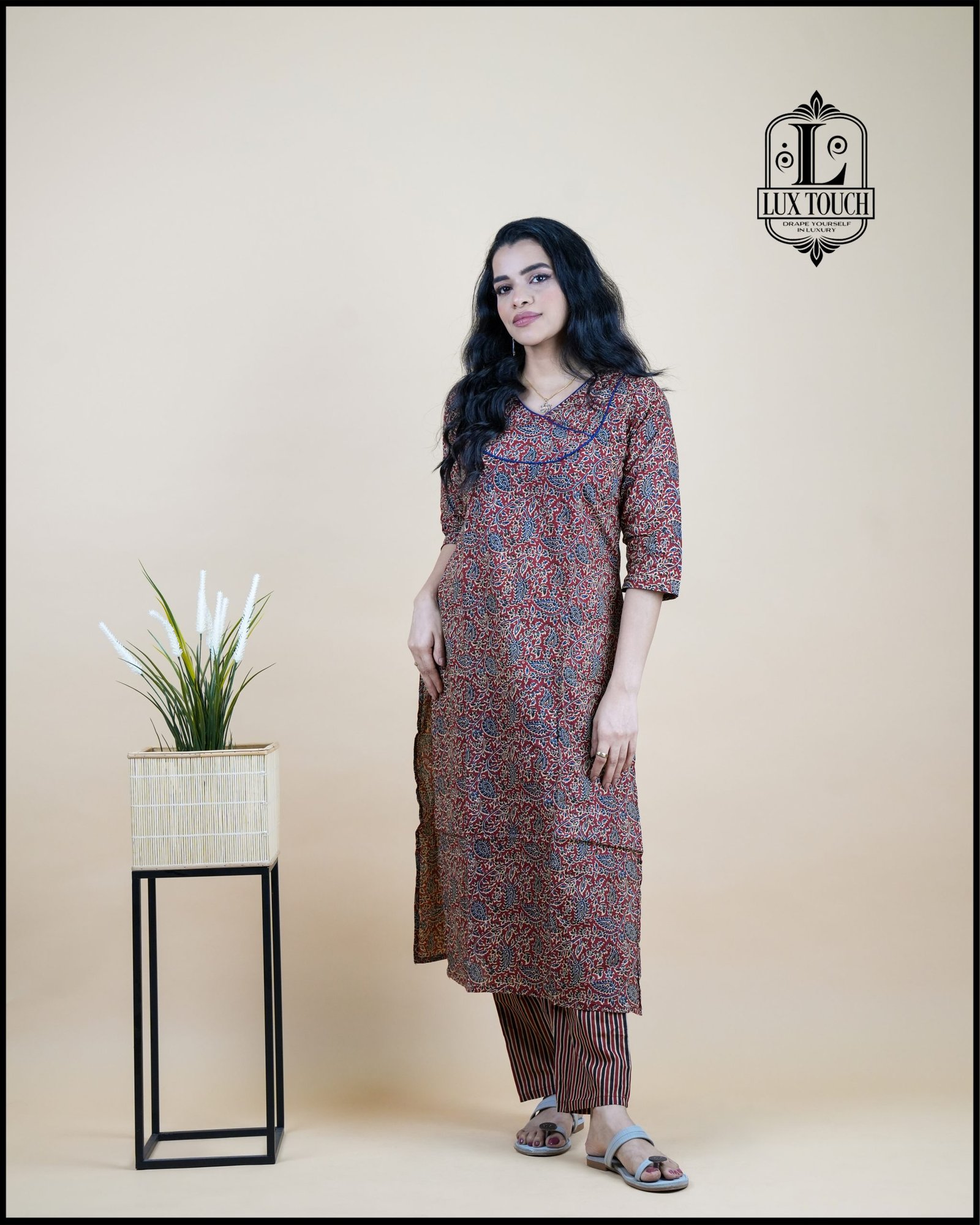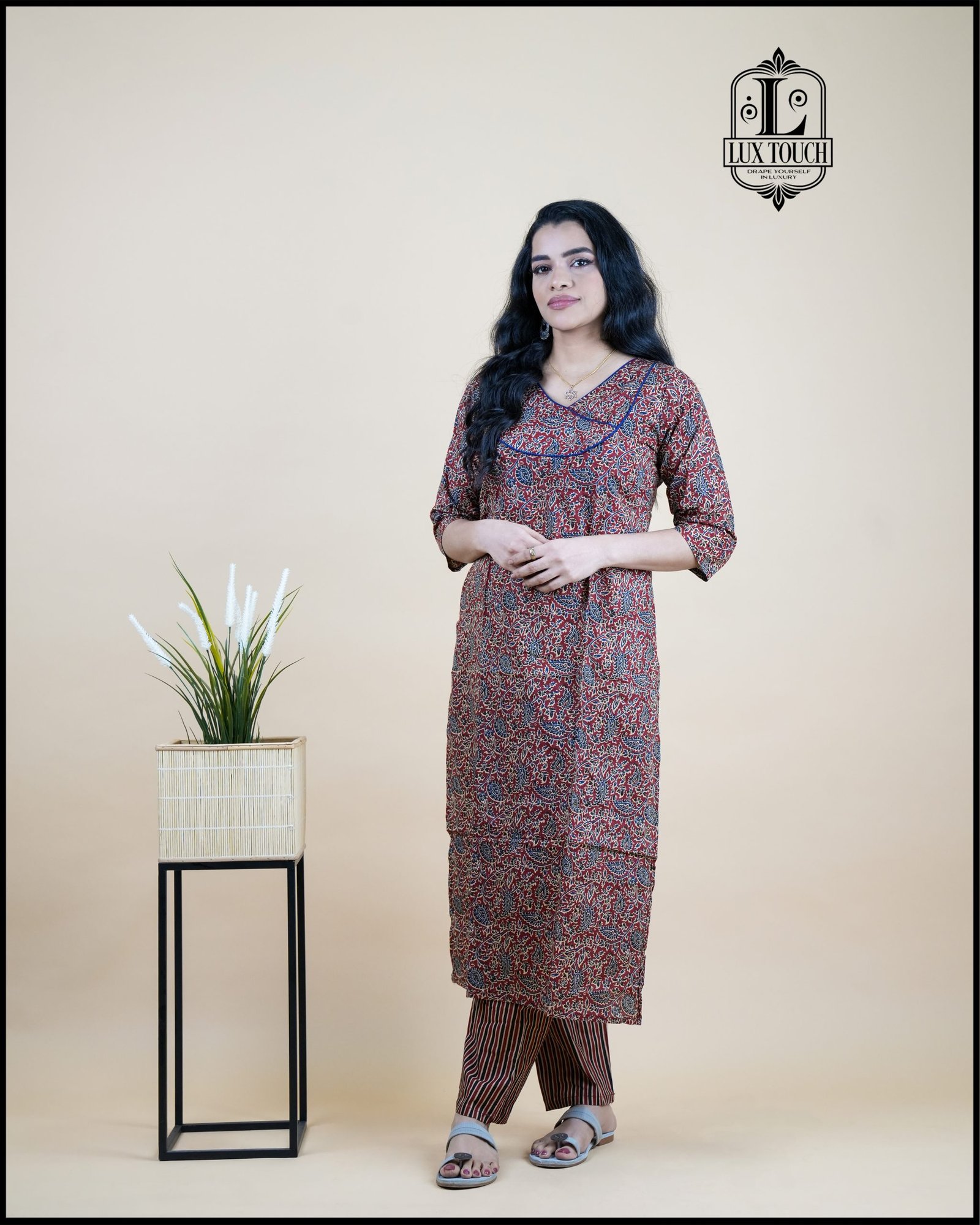 “Elevate your ethnic wardrobe with this beautifully crafted Kalamkari cotton co-ord set. Featuring intricate traditional prints inspired by Indian folk art, this set includes a coordinated top and bottom made from breathable, soft cotton. The natural dyes and earthy tones lend it a rustic yet elegant charm, perfect for festive gatherings, casual outings, or cultural events. Comfortable and effortlessly stylish, this ensemble blends heritage aesthetics with modern-day wearability.”