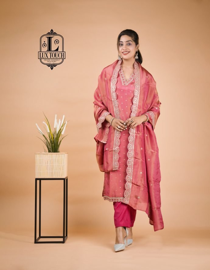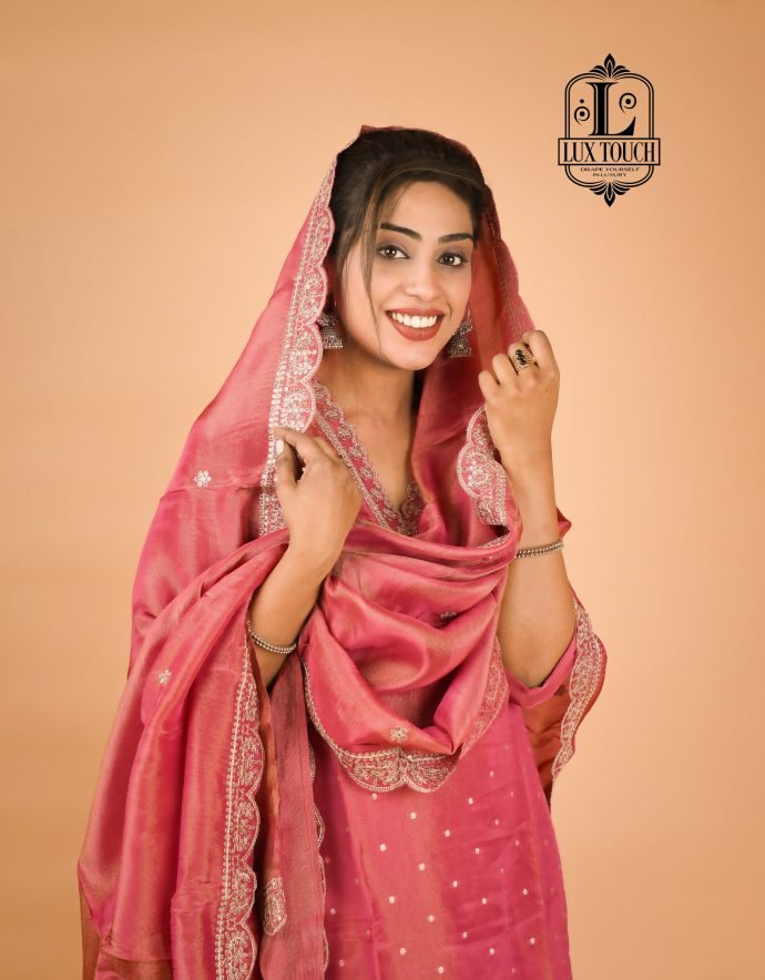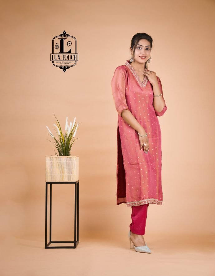 A tissue silk suit is a stunning blend of elegance and comfort, crafted from ultra-soft, lightweight silk that drapes beautifully over the body. The fabric has a subtle sheen, giving it a sophisticated, ethereal glow that catches the light in the most flattering way. The smooth texture feels incredibly soft against the skin, offering a luxurious experience with every wear.
