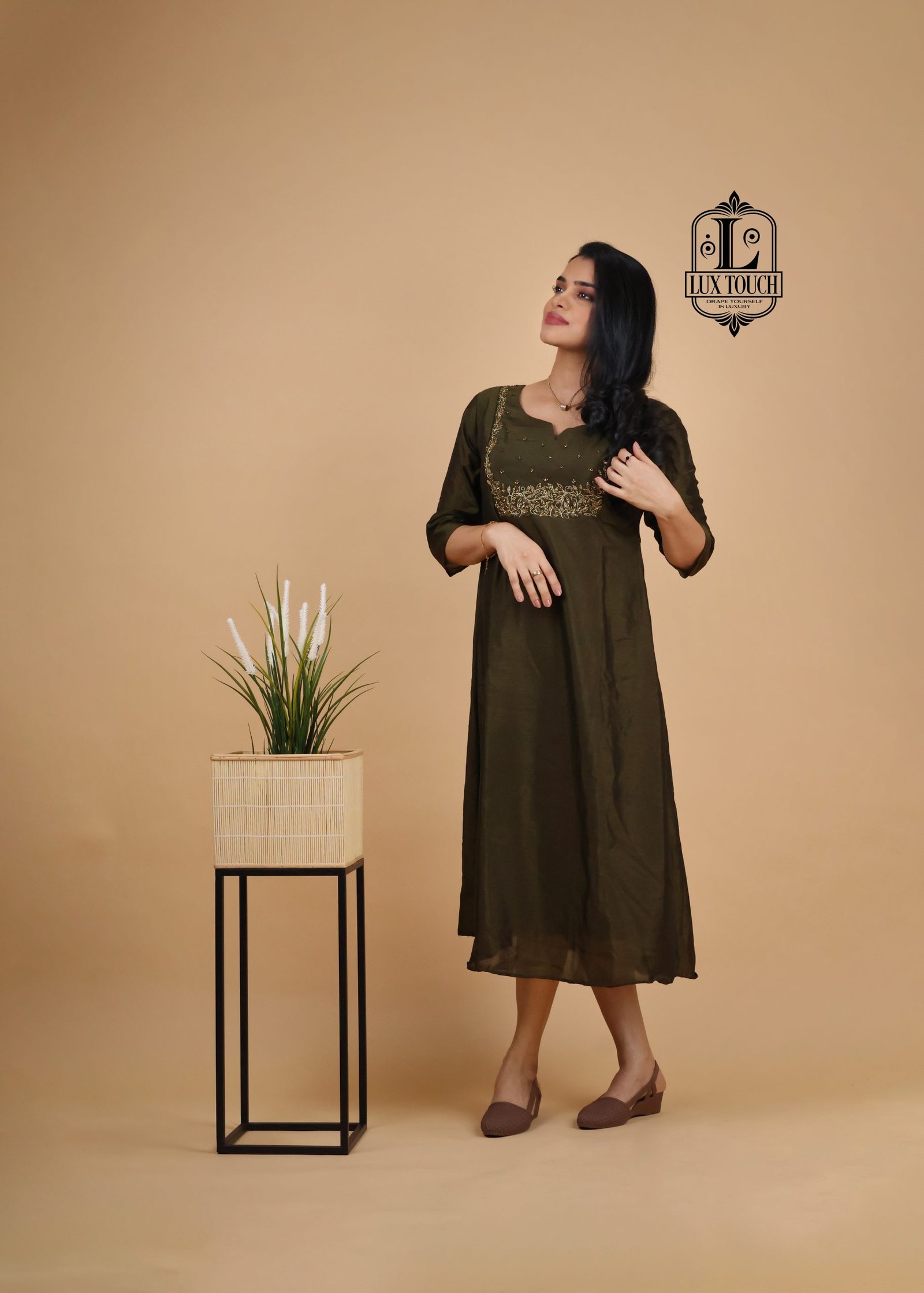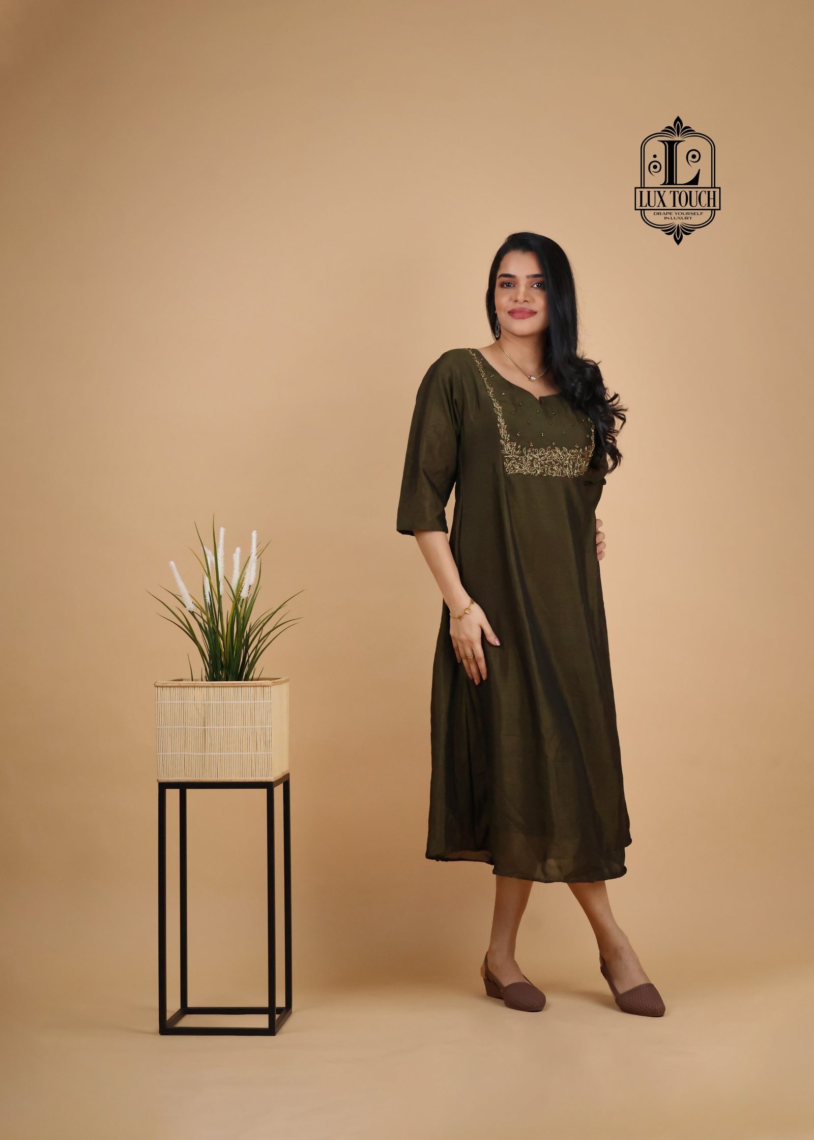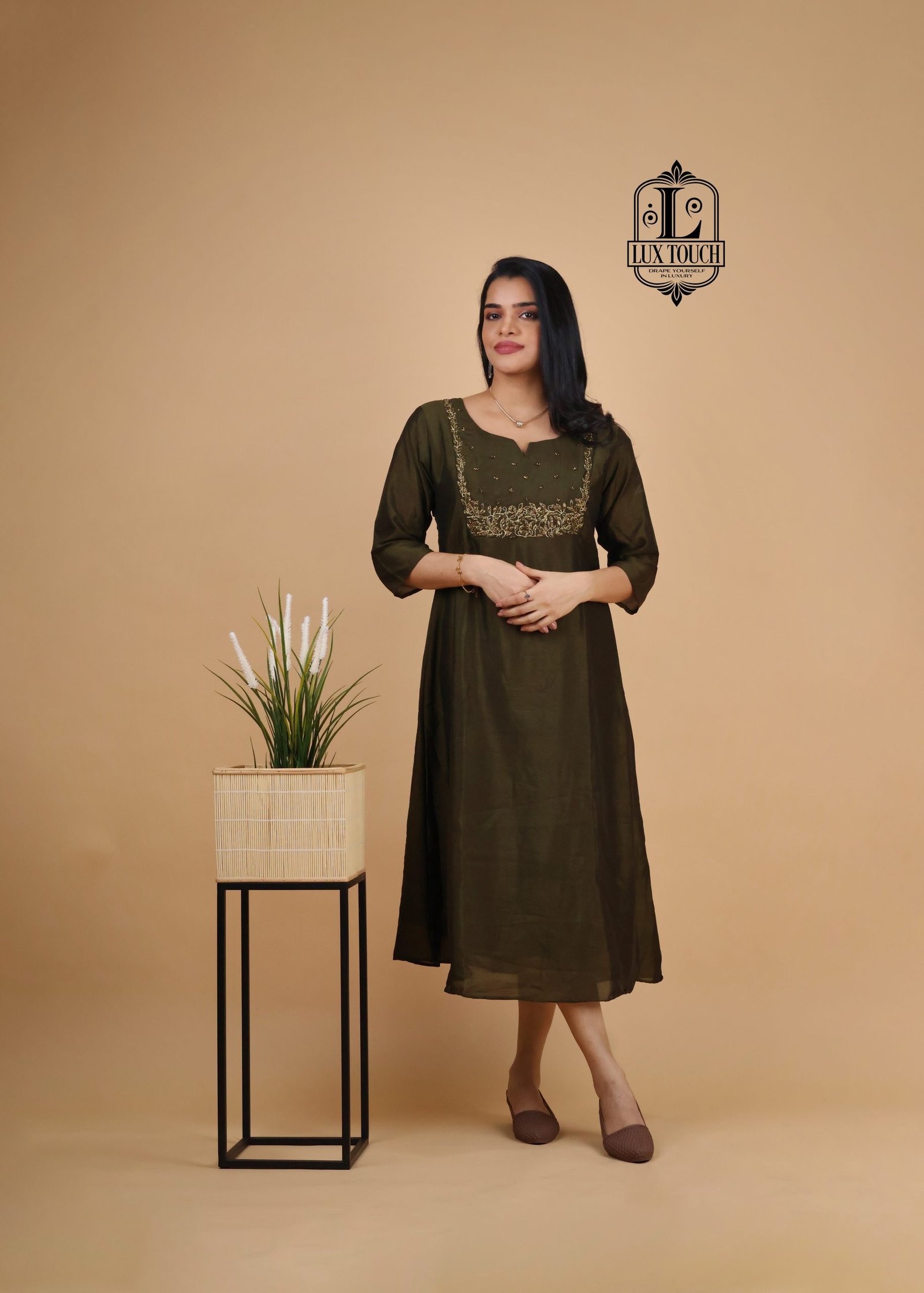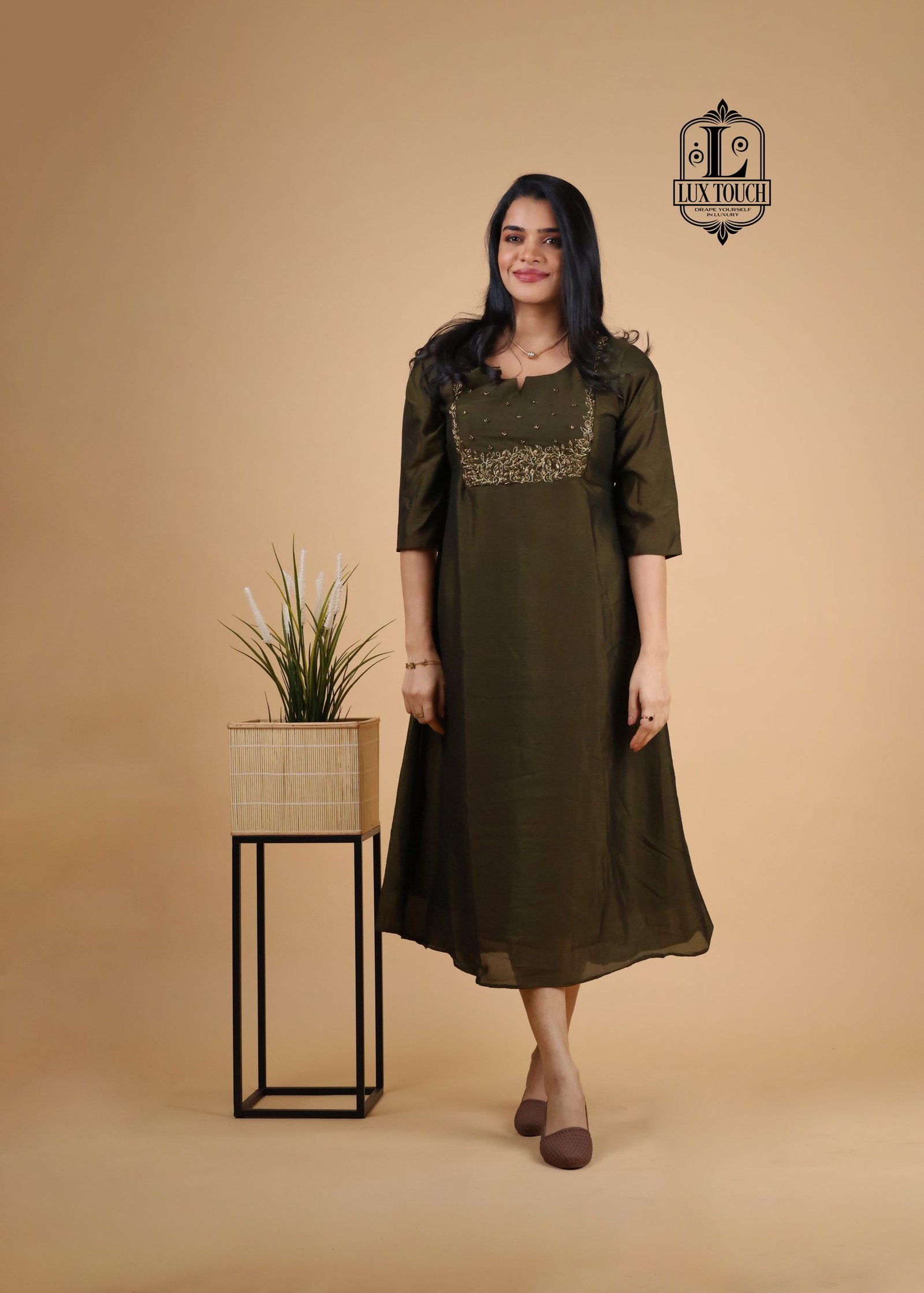 The Vichitra Silk Handwork Kurti is a beautiful fusion of rich tradition and contemporary elegance. Crafted from high-quality Vichitra silk, this kurti showcases exquisite handwork with intricate embroidery, adding a touch of grandeur to any wardrobe. The fine detailing and delicate craftsmanship make it a perfect choice for weddings, festive celebrations, or formal gatherings.